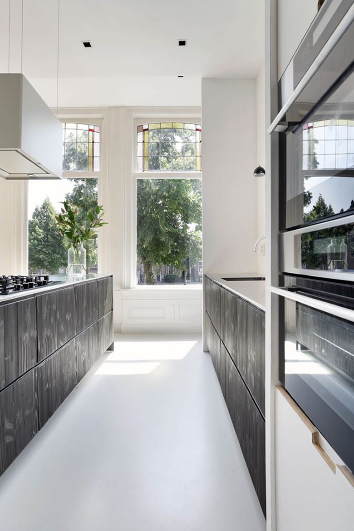 Net als in de huidige situatie zal de woonkamer en de keuken op de eerste verdieping komen. Het kleine keukentje dat nu aan de acherkant zit maakt plaats voor een aparte tv-kamer. Op de mooiste plek van het huis, aan de voorkant met het uitzicht over het water, komt een grote leefkeuken met kookeiland. Hier zullen onze opdrachtgevers het meest vertoeven. Aan de achterzijde van de woonkamer, bij de openslaande deuren naar het balkon, komt een intieme zithoek. De markante schouw die eerst aan de voorzijde van de woning zat wordt zorgvuldig verplaatst en zal het middelpunt van de nieuwe zithoek vormen.