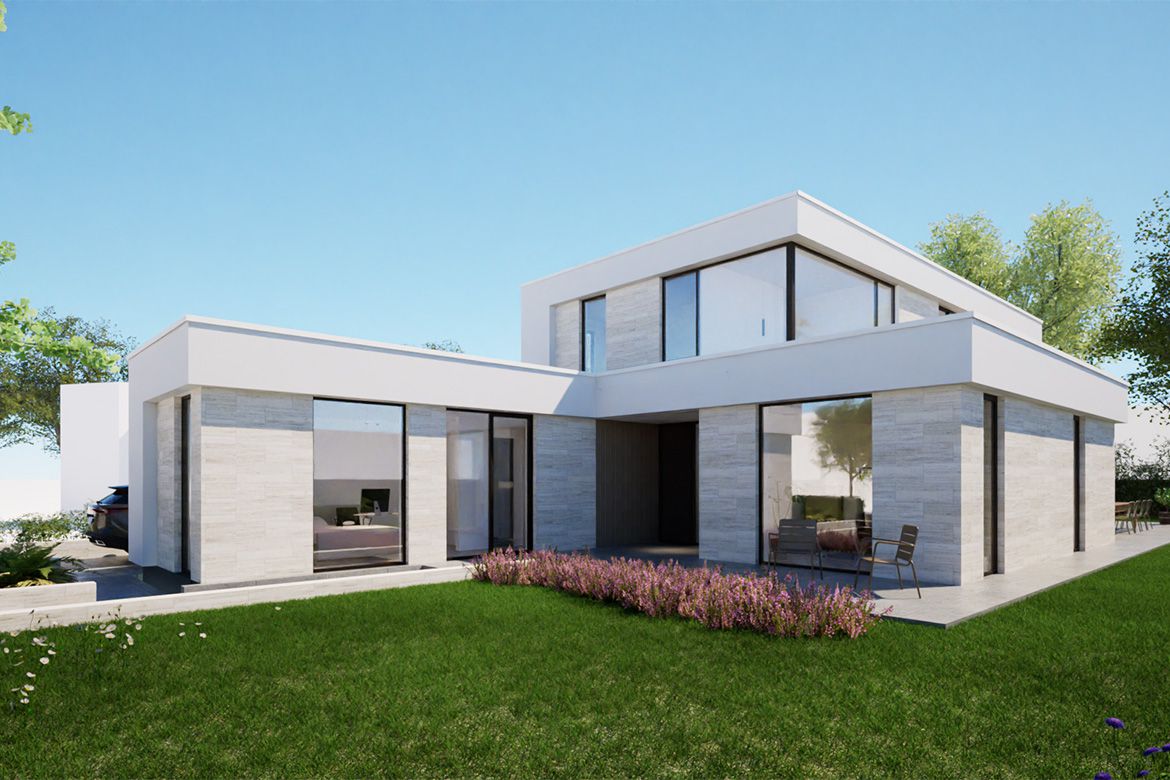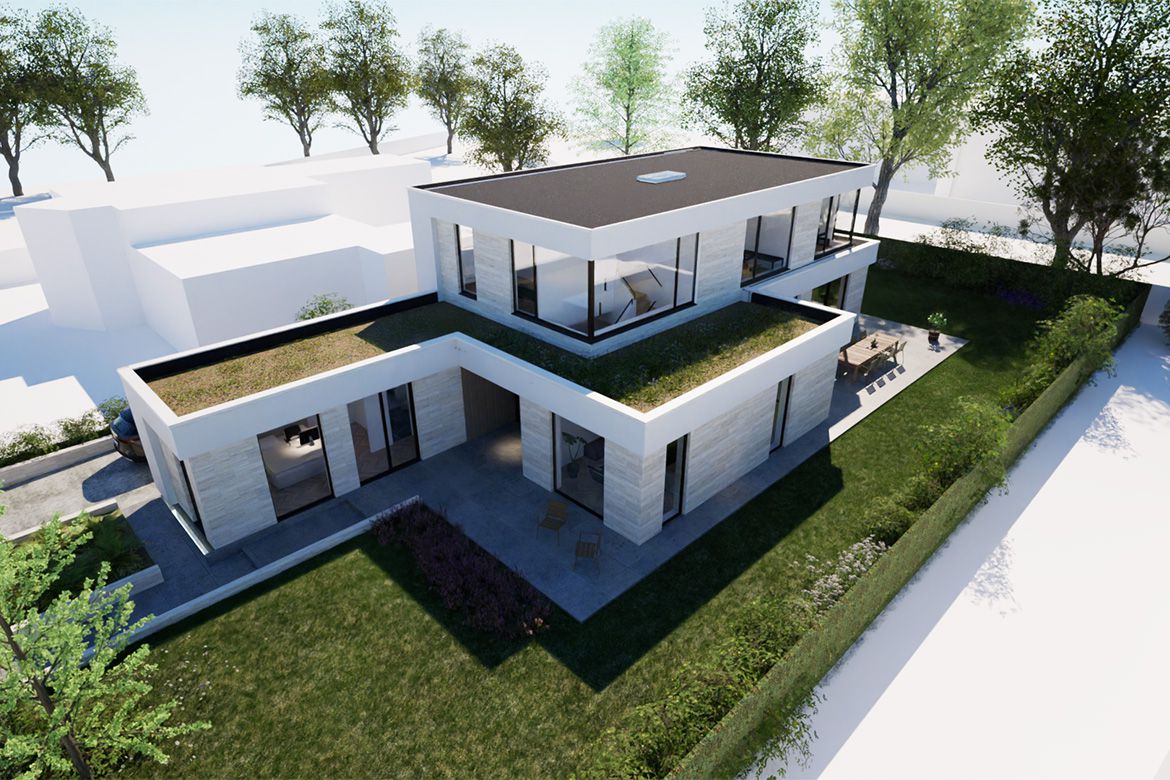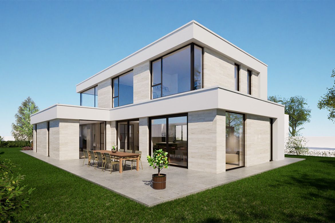 Door het bevestigen van een geïsoleerde schil op de bestaande gevel, het realiseren van overstekken, grote aluminium puien en de combinatie van stucwerk en de travertin natuursteen gevelbekleding ontstaat samen met de optopping een strak geheel.