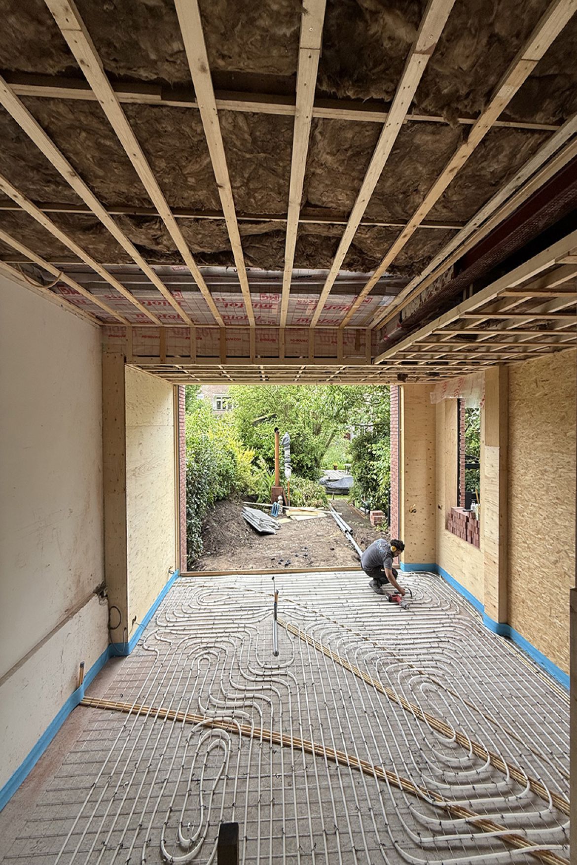 Voor een bijzondere splitlevel woning realiseren we momenteel een unieke uitbouw met een indrukwekkende plafondhoogte van meer dan 3 meter. Deze hoogte zorgt niet alleen voor extra ruimte, maar ook voor prachtig lichtinval via de hoge pui.