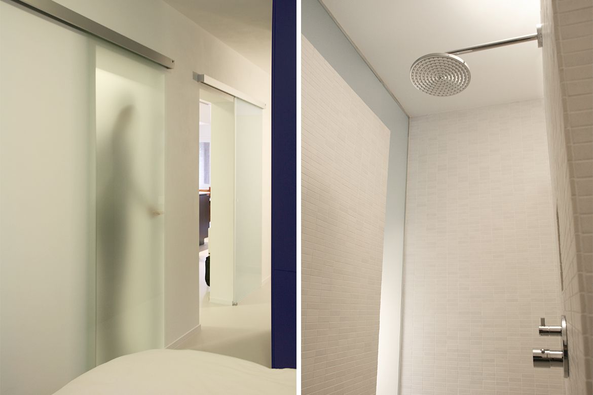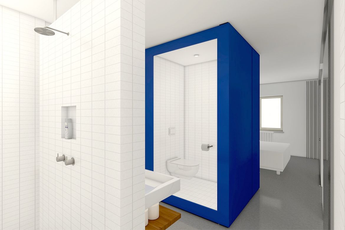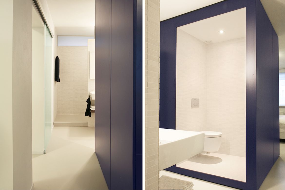 Door het gehele appartement verbindt een neutrale gietvloer de verschillende ruimtes en worden de belangrijkste functies subtiel gescheiden door specifiek vormgegeven meubelstukken. Tussen de slaap- en badkamer is een opvallend blauw meubel ontworpen waarin een kastenwand en een toilet zijn opgenomen. Vanuit de slaapkamer kan de inloopdouche in één doorlopende lijn bereikt worden. Door het natuurlijke daglicht dat vanuit de woonkamer op discrete wijze de badkamer bereikt ontstaat een lichte ruimte die in alle gemakken voorziet.