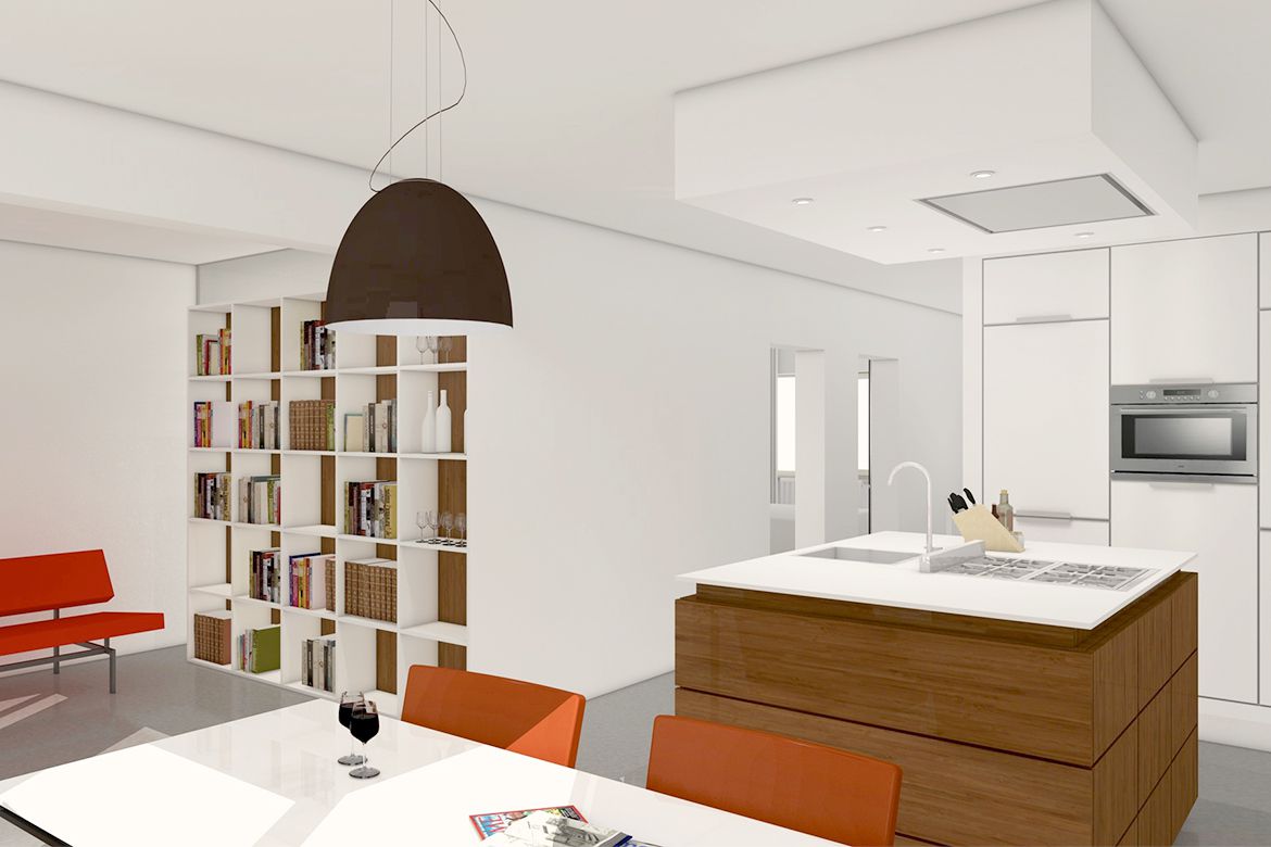 Twee matglazen schuifdeuren scheiden het private gedeelte van de woonkamer en keuken. Het hart van de woonkamer wordt gevormd door een houten kookeiland met een flinterdun aanrechtblad. Achter het kookeiland is een ingekaderde kastenwand geplaatst, waardoor het toilet en de cv-ruimte niet in directe verbinding met de keuken staan. Rondom de keuken kan gewerkt worden, en is tevens plaats voor een eettafel aan het raam. De houten afwerking komt terug in een boekenkast die de scheiding vormt met de badkamer. De matglazen omlijsting die de daglichttoetreding tot de badkamer verzorgt gaat geruisloos op in de bestaande structuur van wanden en balken.