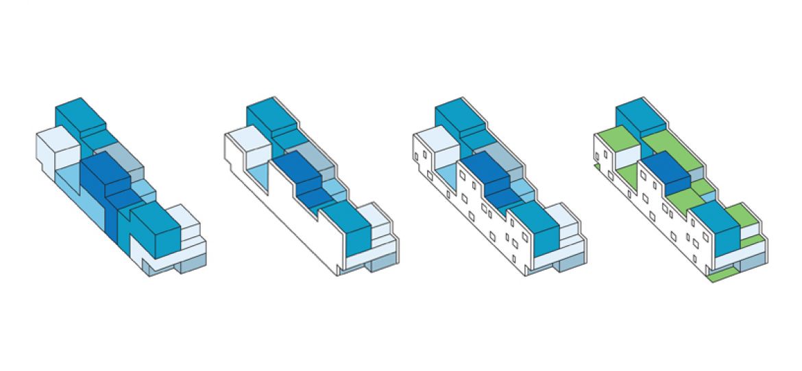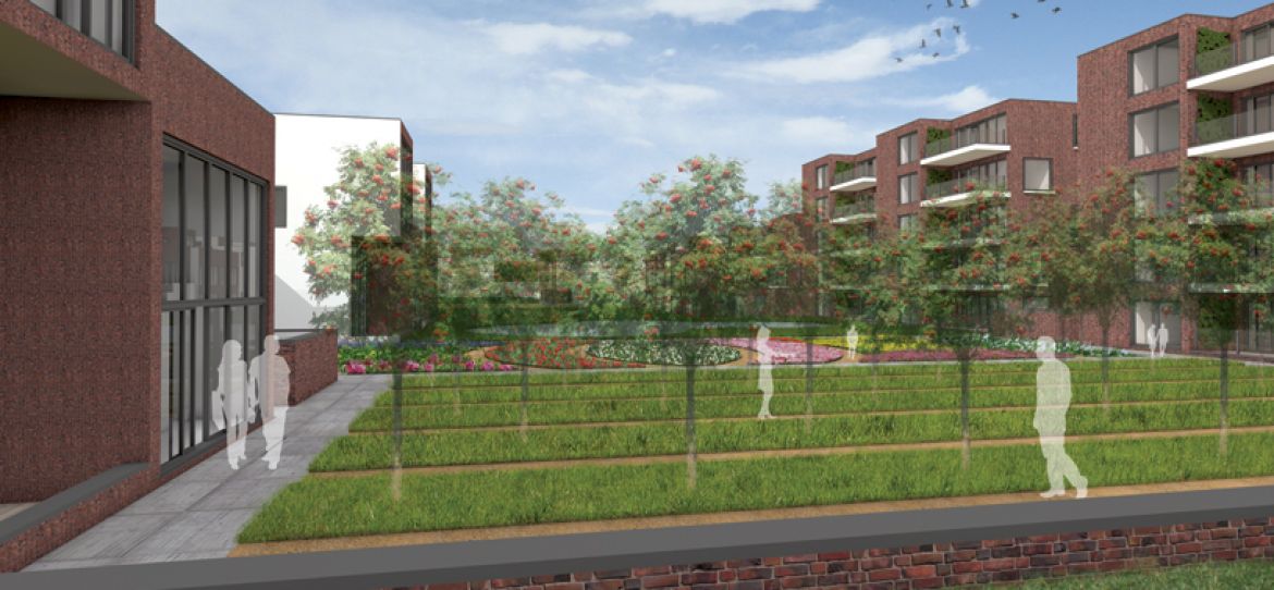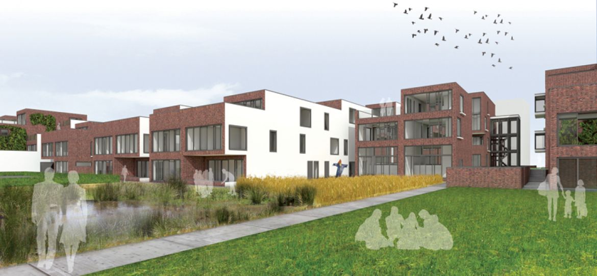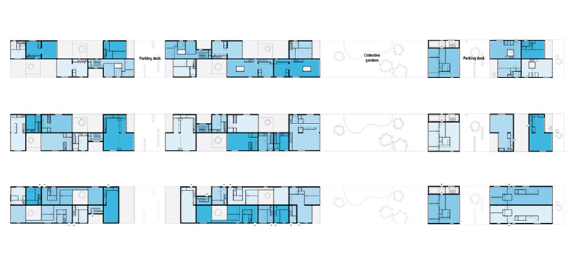 De tuin wordt begeleid door een tweetal zones met woningen, die door middel van een gradiënt in hoogte en typologie aansluiten op hun omgeving. De woningen zijn gebaseerd op een principe van verweven volumes, waardoor een grote variëteit in woonvormen ontstaat die allen een private buitenruimte tot hun beschikking hebben. Door het parkeren onder een tweede maaiveld op te lossen wordt de auto aan het zicht onttrokken en ontstaat een semi-publieke buitenruimte tussen de woningen. Smalle paden tussen de bouwblokken garanderen de porositeit van de locatie en voegen een nieuwe laag van verbindingen en ontmoetingen toe die de centrale tuin ondersteunen en openen voor alle generaties van de stad.