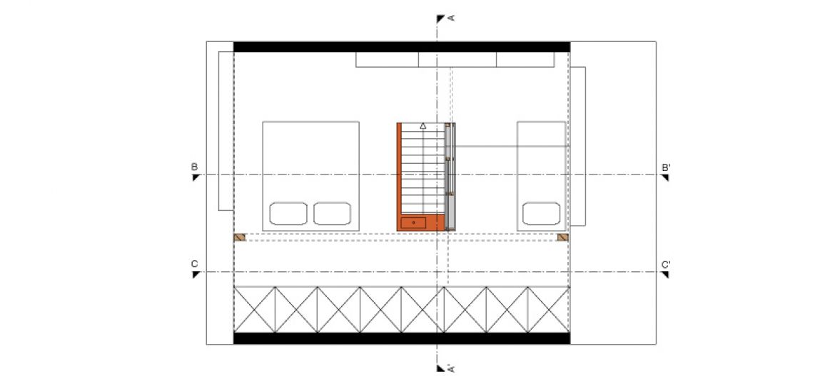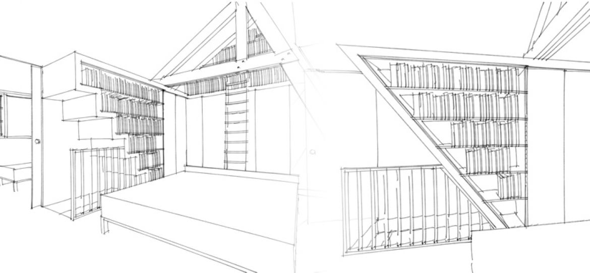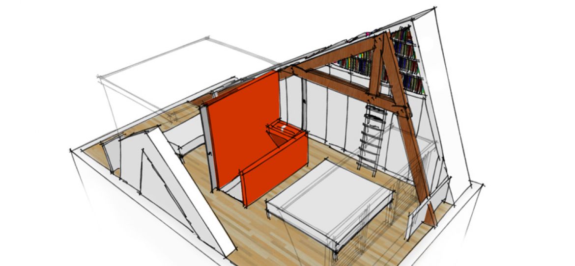 Door in het ontwerp uit te gaan van meubelstukken in plaats van standaard muren en deuren blijft de zolder net zo open als voorheen, waardoor licht en lucht door de ruimte kunnen stromen. Het hoogtepunt van het ontwerp wordt gevormd door een in het oog springend wandmeubel met daarin zowel het trapgat, een wastafel én een tweetal schuifdeuren verwerkt. Hierdoor is het mogelijk om de zolder snel op te splitsen in een tweetal kamers, waardoor een extra logeerkamer of (tijdelijke) opbergruimte ontstaat.