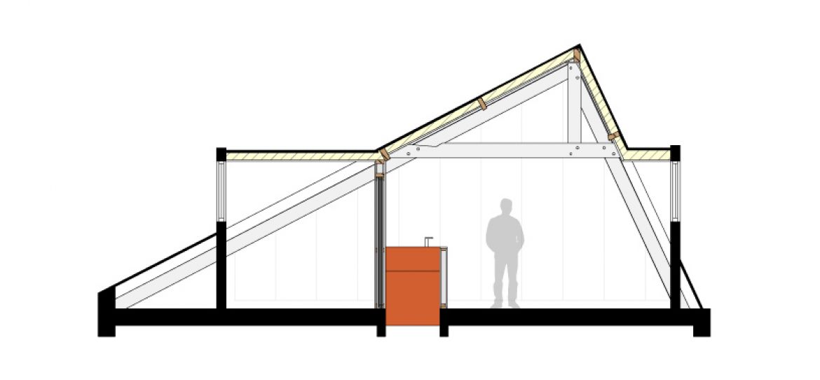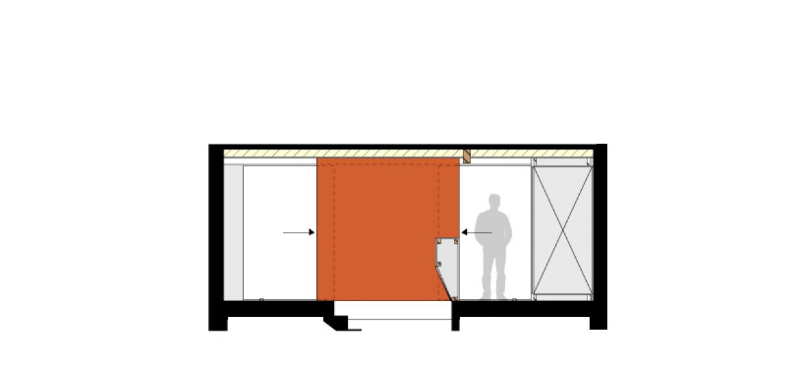 Aan de lange zijde van de zolder is een grote nieuwe wandkast geplaatst, waarin voldoende ruimte aanwezig is om de oude bergfunctie van de zolder over te nemen. Door in deze kast ook de CV en de wasmachine op te nemen blijven deze in het vervolg buiten zicht. De punt van deze kast, in de nok, kan optioneel worden gebruikt als boekenkast of als bergkast. In de kast is een horizontale balk opgenomen die overeenkomt met de ligger in het spant, zodat de vorm van het spant verder wordt benadrukt.