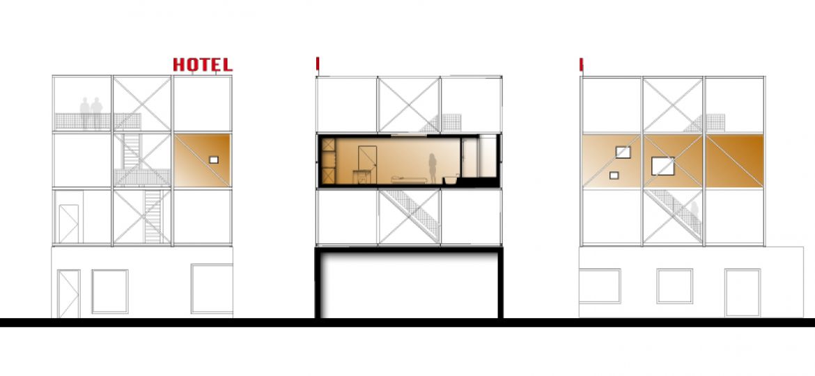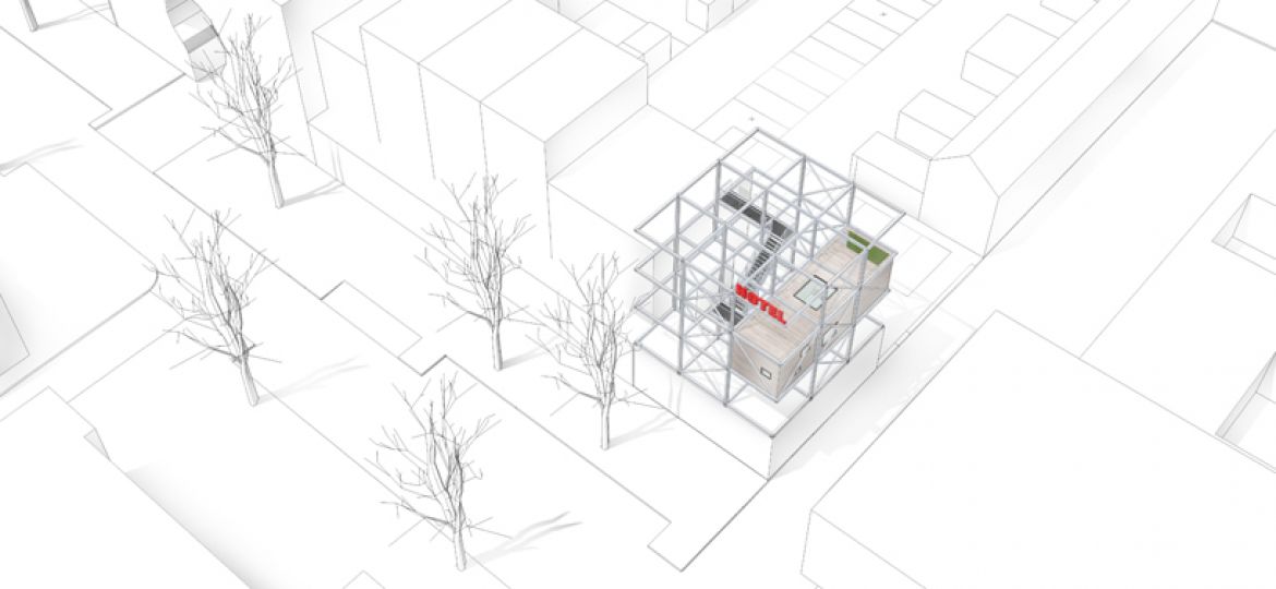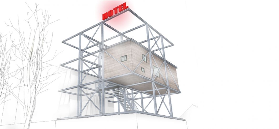 Tussen de grote bouwblokken, die de entree van het Baekelandplein bijna willen verbloemen, lijkt een optopping met beperkt budget nauwelijks kans te hebben. 1 BEDROOM HOTEL laat zien hoe het ook kan. Om wel aansluiting te vinden bij de harde contouren van de naburige bouwblokken, bestaat het chassis van het bouwwerk uit een ragfijne staalconstructie. De constructie spant het volume op dat voor een dergelijke locatie gewenst zou zijn: in lijn met de naastgelegen panden, maar dan in een transparante gedaante. Op de constructie van 1 BEDROOM HOTEL prijkt de lichtreclame ‘HOTEL’. Maar waar een hotel altijd plaats biedt aan meerdere kamers, wordt dit bouwwerk slechts op één plek voorzien van invulling: een exclusieve suite van 30 vierkante meter. Logeren in Woensel West wordt een speciale ervaring, één om nooit meer te vergeten. Tijdens een verblijf is het hotel even van jou en maak je op een bijzondere wijze kennis met de omgeving. De staalconstructie wordt ‘s avonds subtiel verlicht en de industriële, open trap leidt vervolgens de weg naar de hotelkamer. Geen liftmuziek of kamerjongen, maar transparant en in relatie met de directe omgeving.