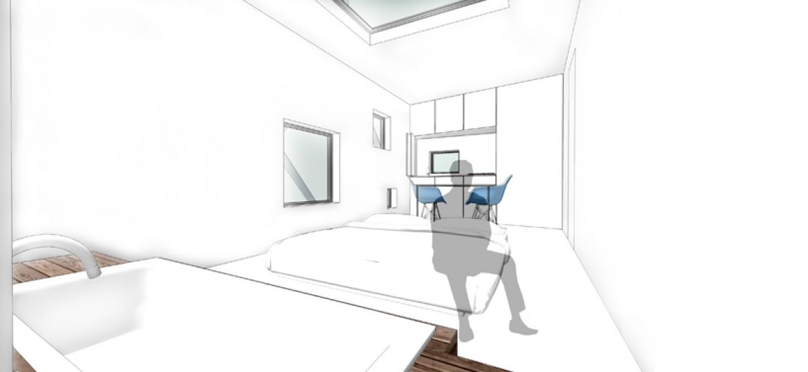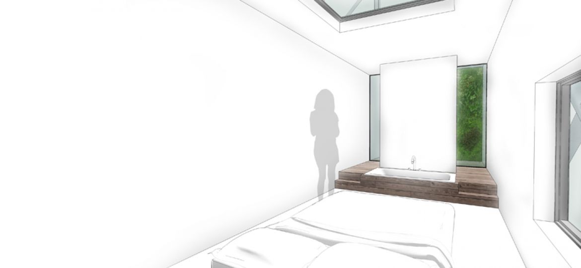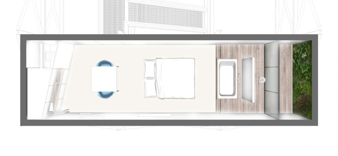De suite wordt gevormd door een langwerpig, houten volume dat in de staalconstructie opgehangen is. In het interieur staat een groot tweepersoons bed letterlijk centraal onder een groot daklicht. De badkamer grenst aan een groene patio, waardoor een gevoel ontstaat van douchen in de open lucht. En hoewel er niemand naar binnen kan kijken, voelt de logée zich misschien even naakt; een subtiele verwijzing naar het aangrenzende Baekelandplein. Helemaal bovenin de staalconstructie van het hotel bevindt zich een kraaiennest dat uitzicht biedt over een stukje Eindhoven dat veelal niet in brochures verschijnt. 1 BEDROOM HOTEL zoekt deze plekken juist wel op en geeft de logée een unieke ervaring. Het bouwwerk combineert de paradoxale aspecten van exclusiviteit en de perceptie van een probleemwijk door een open en (h)eerlijke ingreep in de wijk.
