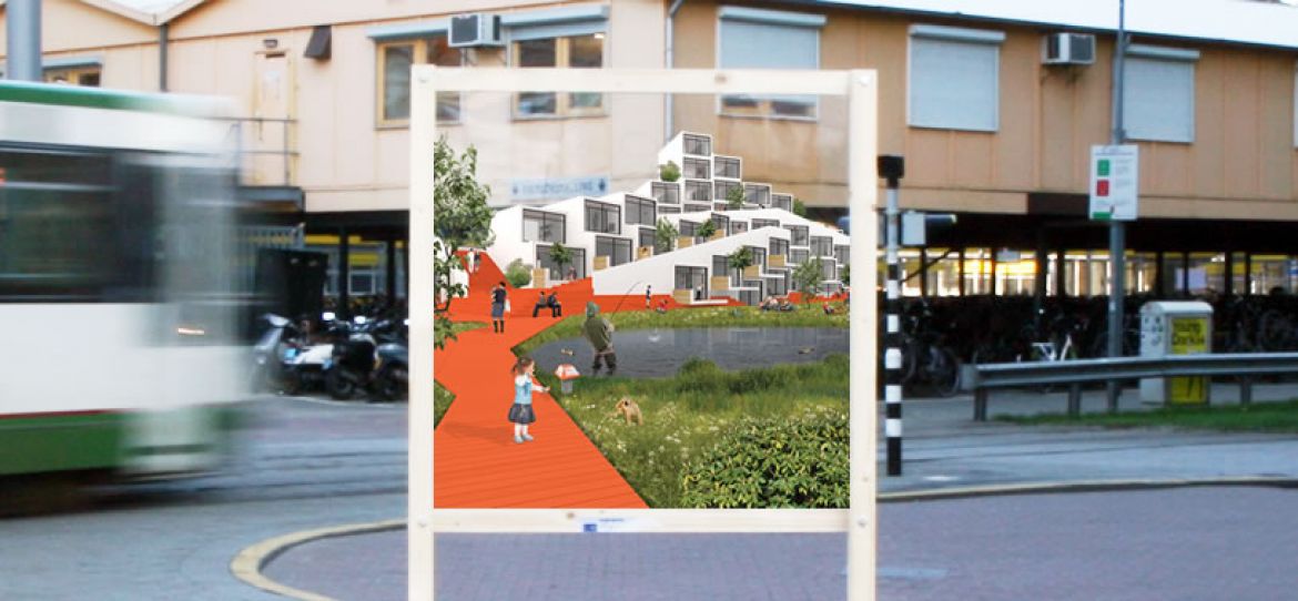 EN: For the International Architecture Biënnale Rotterdam 2012 seven young architectural firms are asked to present their vision on one of Rotterdams densification strategies. The individual visions are presented by means of ‘analog augmented reality’: the fysical image is printed on a glass plate, which gives passing pedestrians a view of the vision merging with the existing city structure. Our vision encompasses ground-based dwellings on an unexpected site: next to the new Rotterdam Central Station.