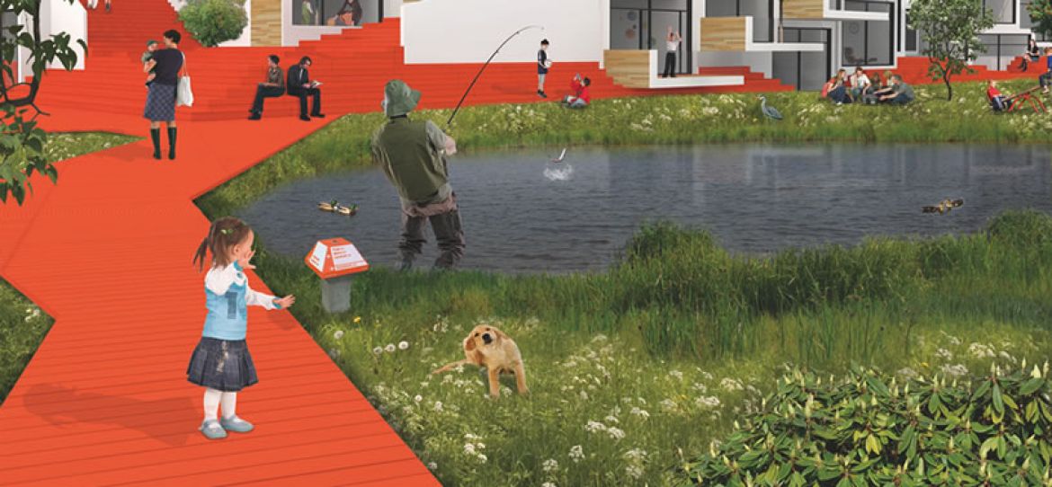 EN: Winding Streets breaks with the orthogonal grid of post-war Rotterdam central discrict. A dense structure of streets and alleys composes a continuous route, while giving access to the individual dwellings and their gardens. Elevating this route makes it possible to create a dense configuration, and provides each residence its own unique situation, floorplan and view. On this small plot in Rotterdam arises a vivid green district where liveliness and a safe social structure go hand in hand.