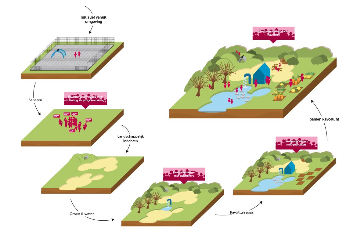Op elke plek komt een Ravottuh-huisje: een archetypisch bouwwerk dat bestaat uit een stalen frame met wisselende invullingen. De mogelijkheden voor deze invullingen zijn eindeloos en op elke plek anders. Zo kan er bijvoorbeeld een opbergkast, een klimwand, een plantenkas of een speelhuisje in gemonteerd worden.