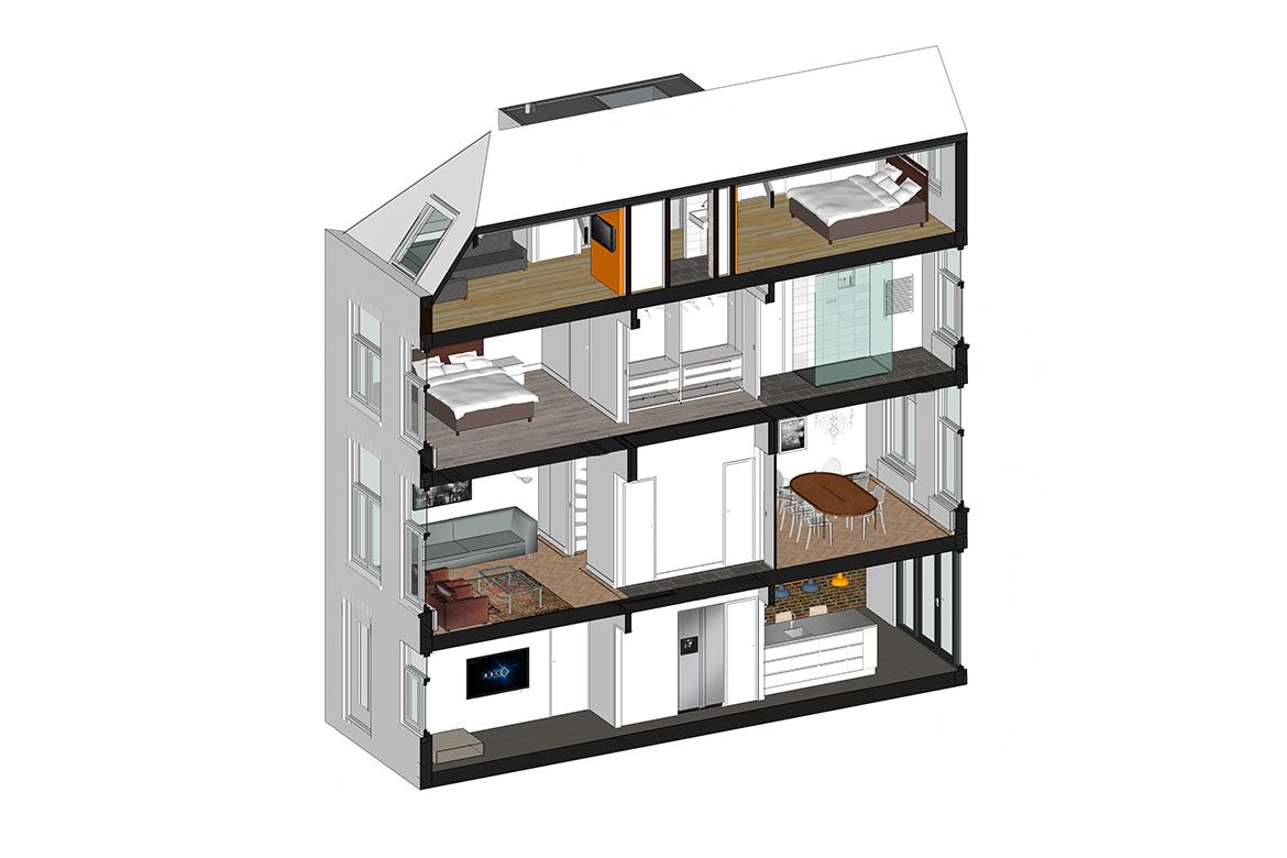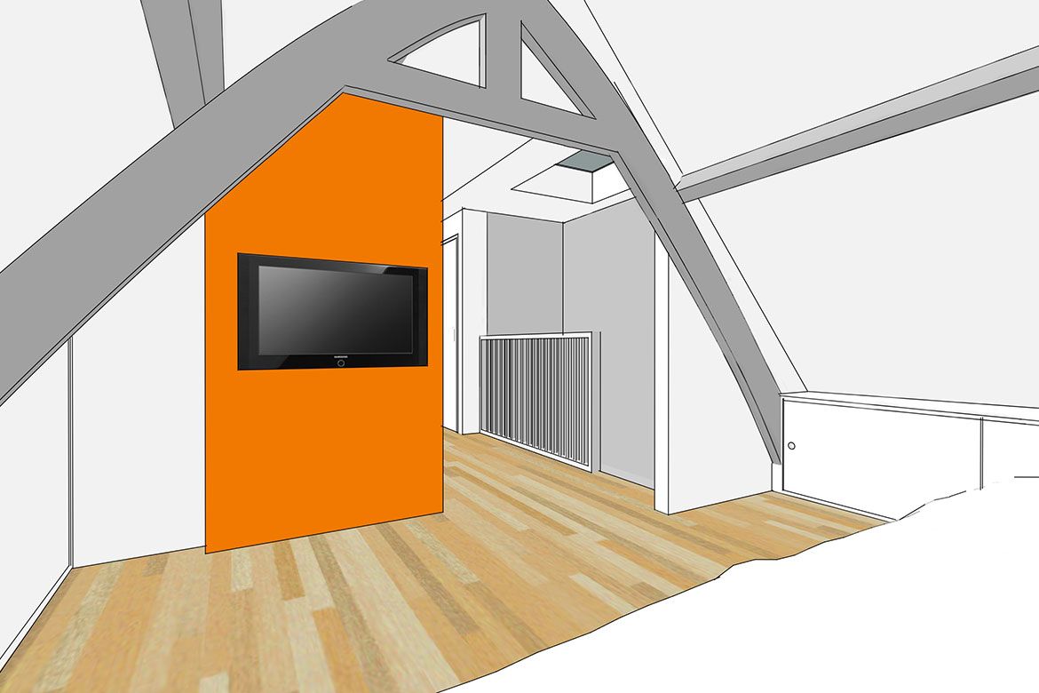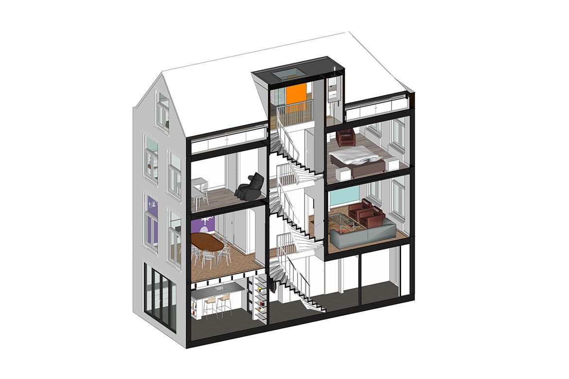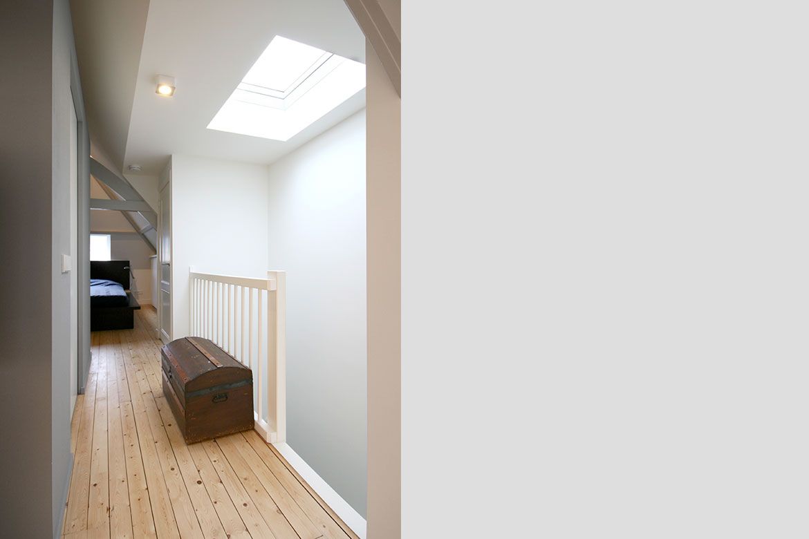 De tweede verdieping en zolder worden verbouwd tot slaapverdiepingen, met ieder een eigen badkamer. De zolder is bereikbaar door middel van een nieuwe trap en dakkapel en is ingericht als een open ‘studio’ voor gasten, met centraal een opvallende badkamer.