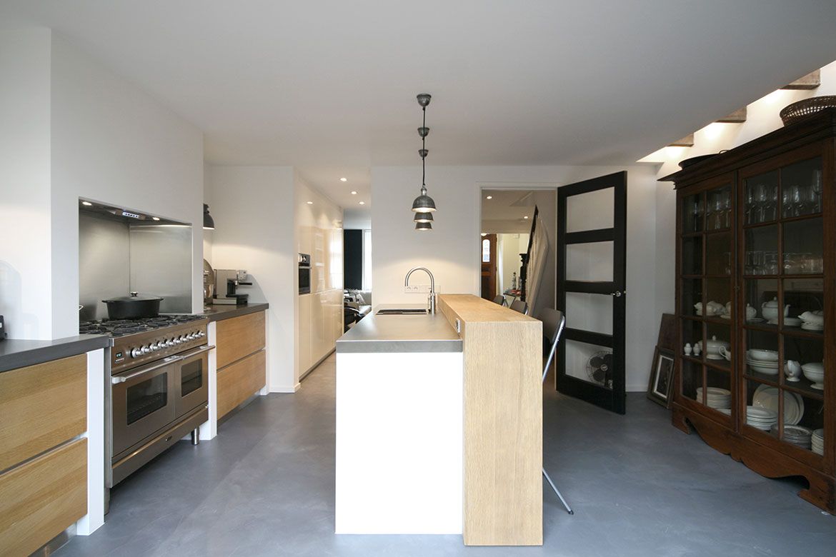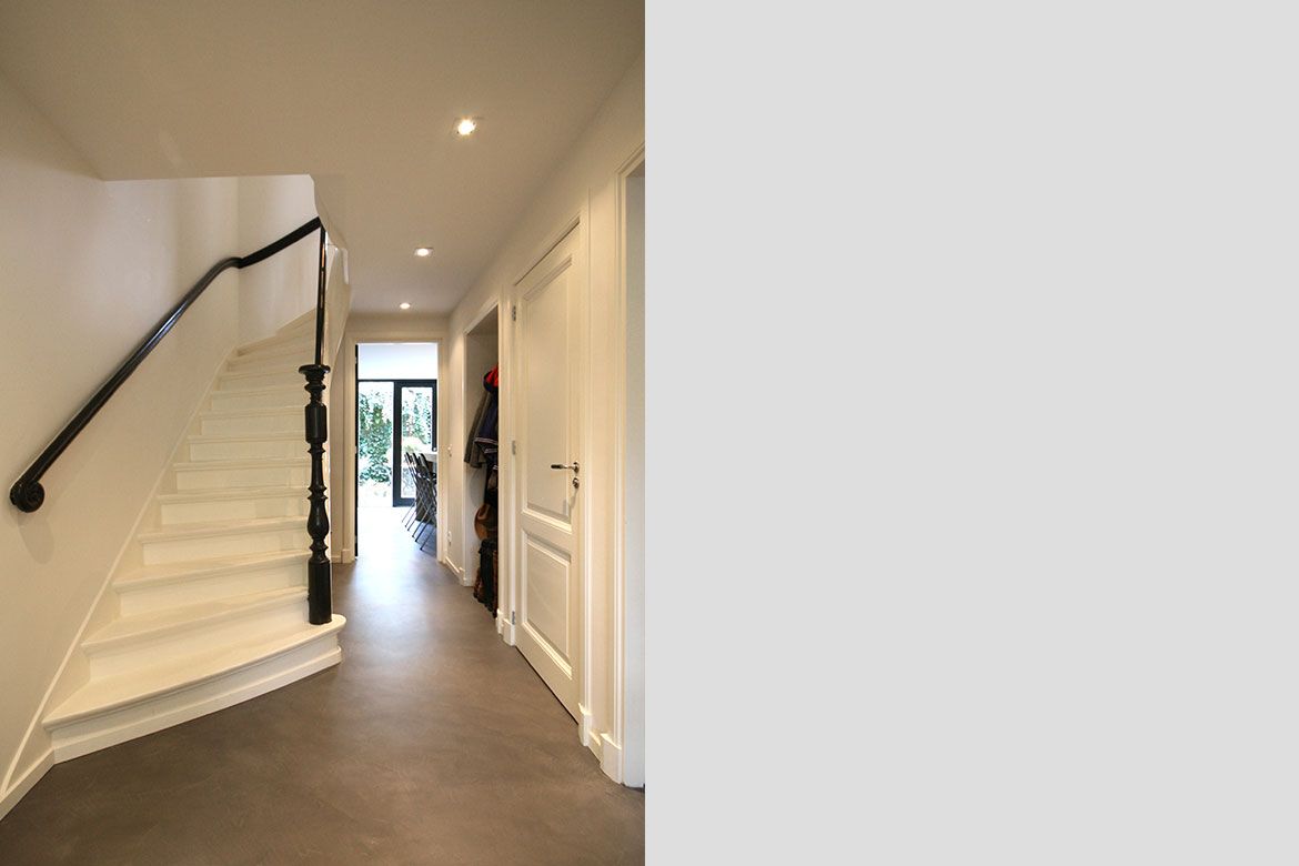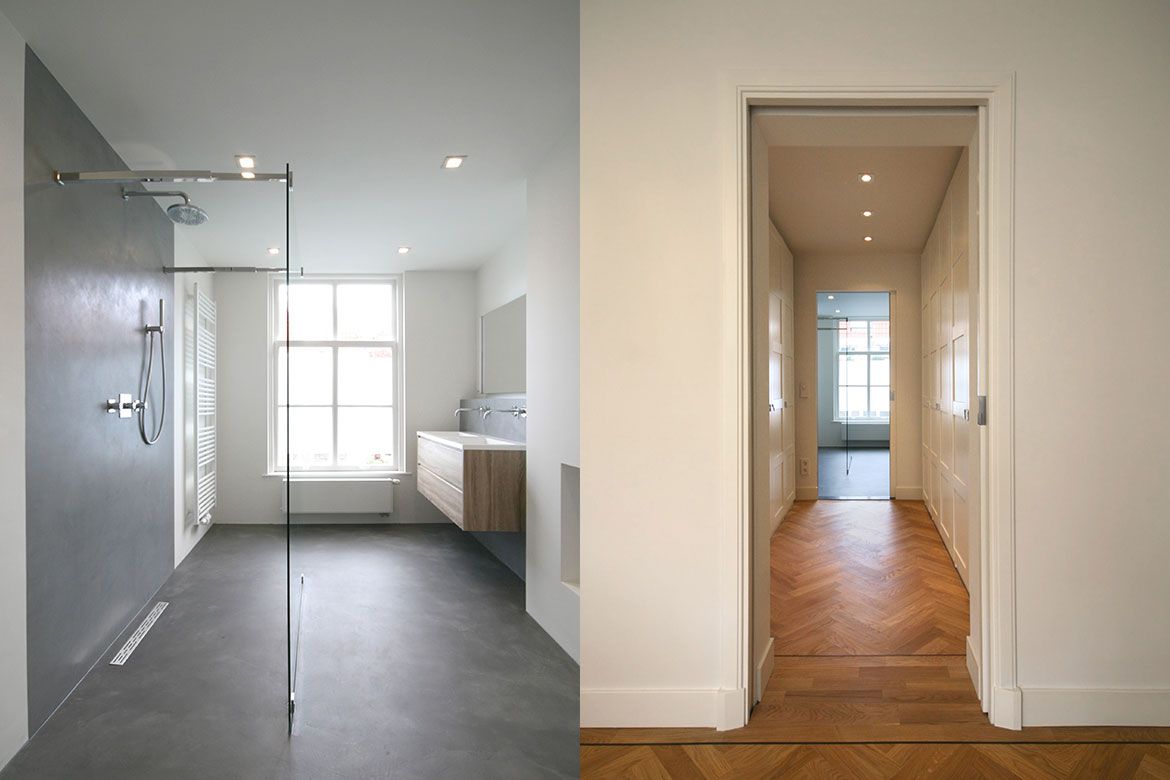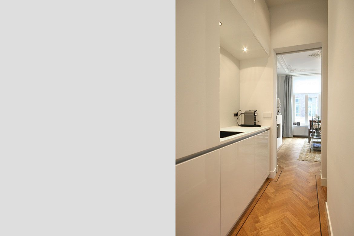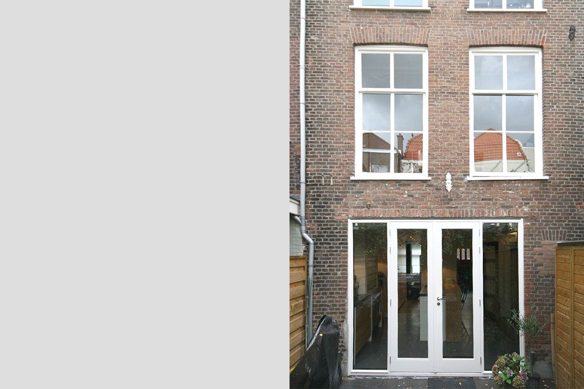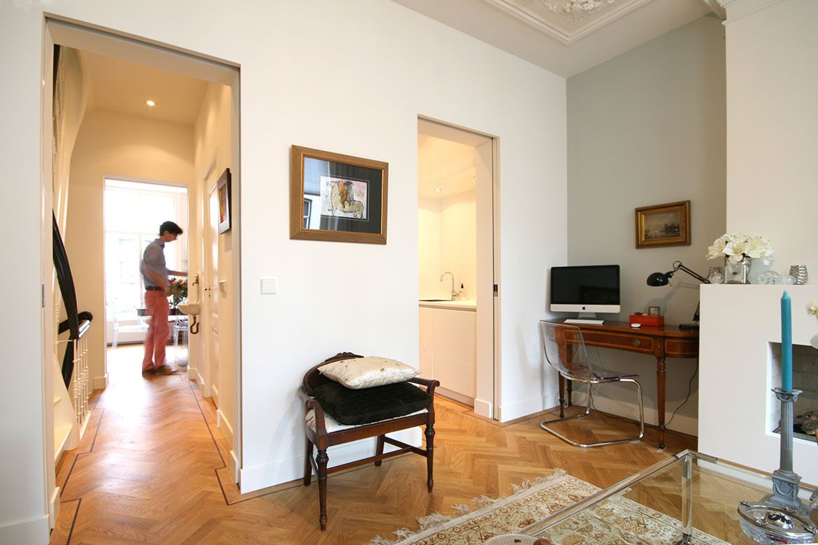 Op de begane grond wordt een grote keuken gerealiseerd, slim gebruik makend van bestaande elementen als de schouw. De eerste verdieping, waar nog veel originele details aanwezig zijn, wordt verbouwd tot woonkamer en eetkamer. De hoogte van deze verdieping wordt benadrukt door het toepassen van bijna verdiepingshoge ‘onzichtbare’ schuifdeuren. Om de relatie tussen de keuken en eetkamer te benadrukken en de keuken te voorzien van het nodige daglicht wordt er een sparing aangebracht in de vloer tussen beide ruimtes.