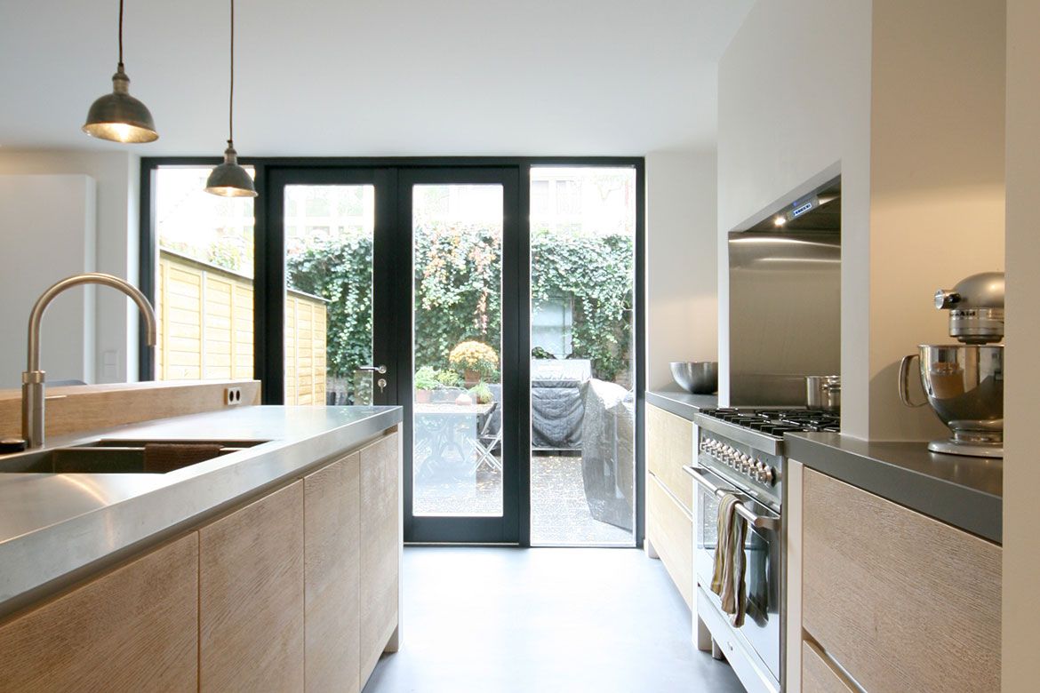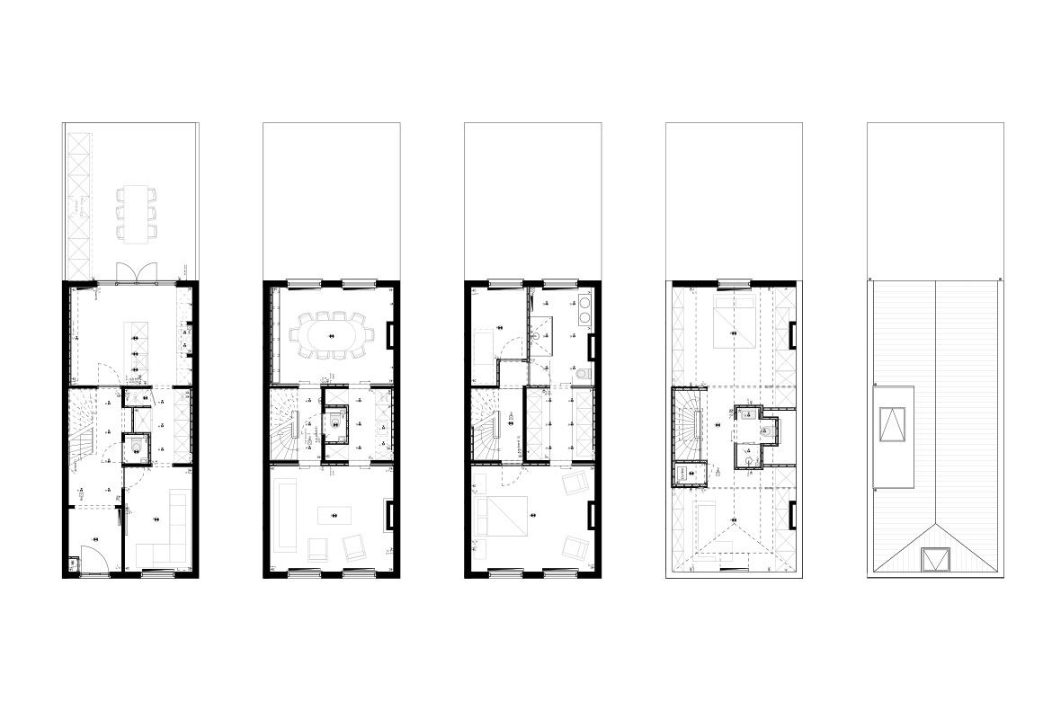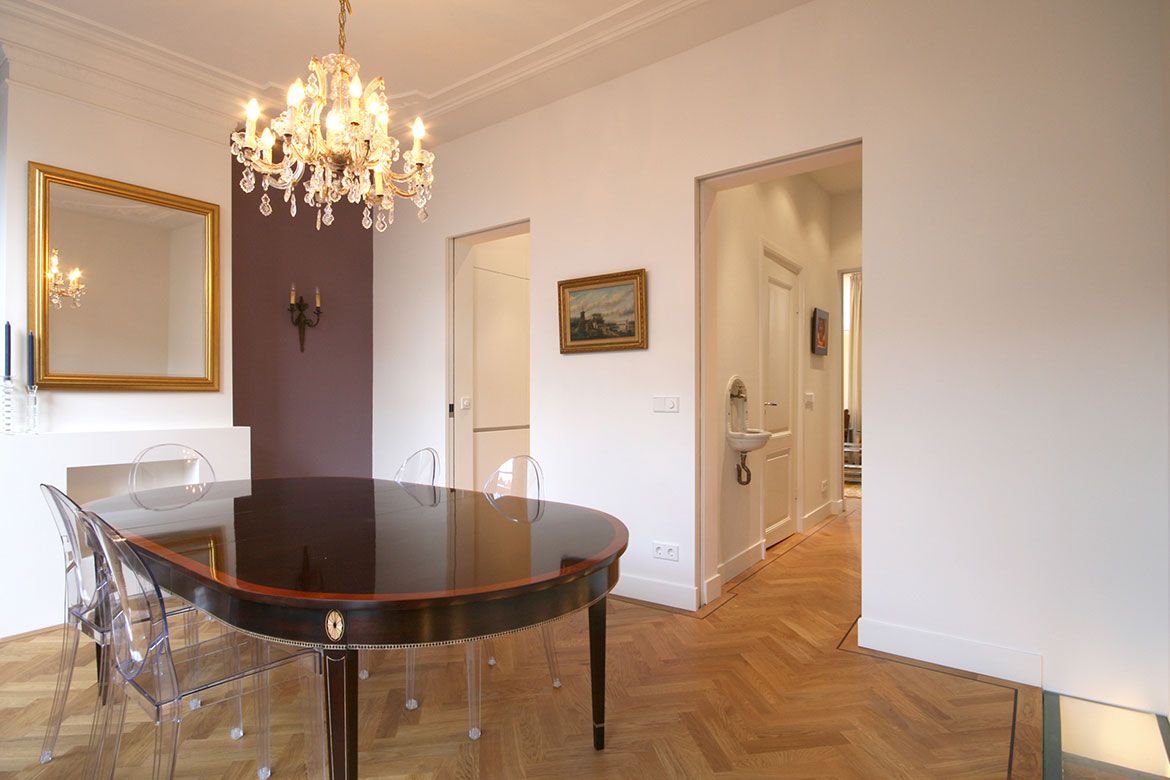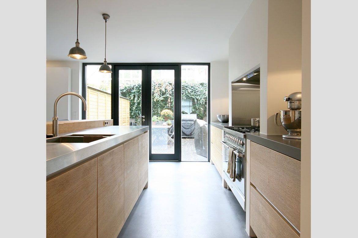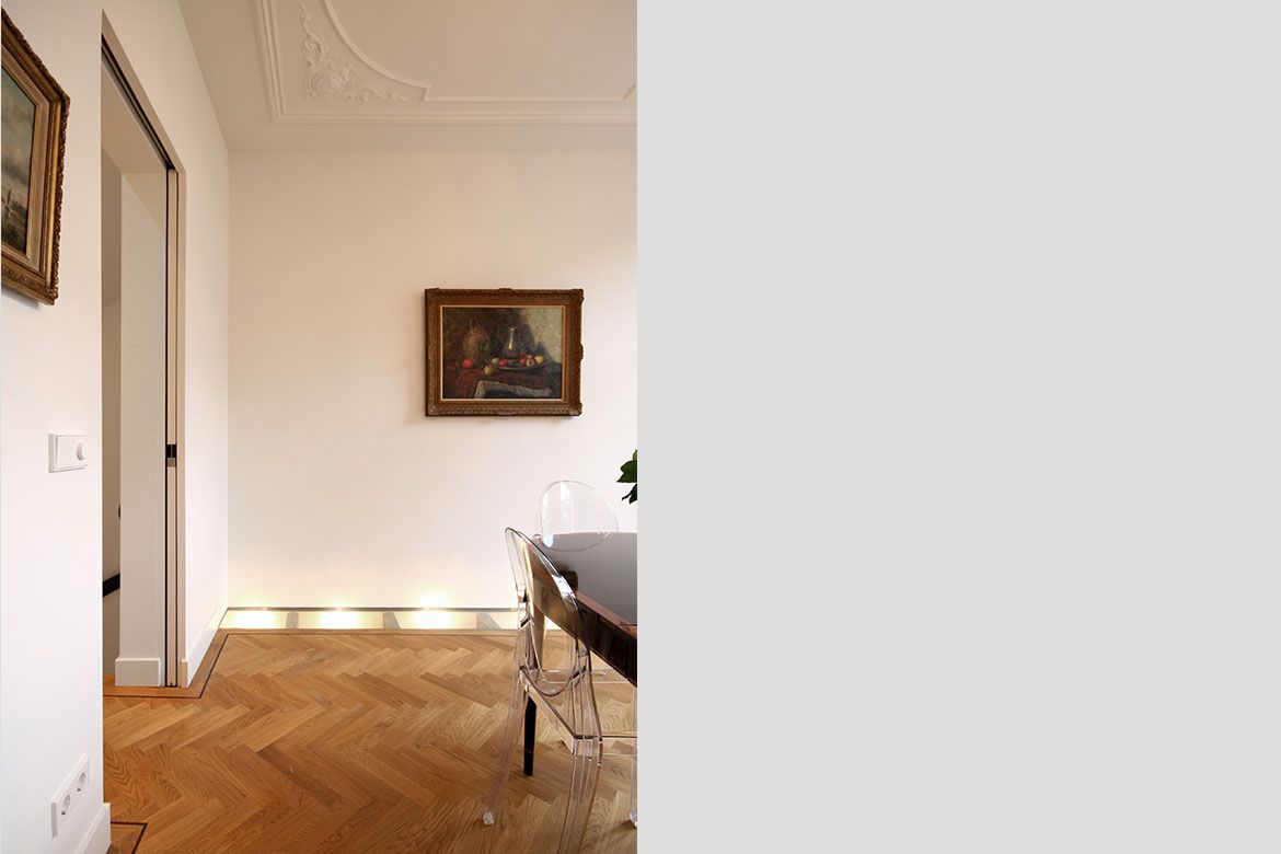 Op de begane grond wordt een grote keuken gerealiseerd, slim gebruik makend van bestaande elementen als de schouw. De eerste verdieping, waar nog veel originele details aanwezig zijn, wordt verbouwd tot woonkamer en eetkamer. De hoogte van deze verdieping wordt benadrukt door het toepassen van bijna verdiepingshoge ‘onzichtbare’ schuifdeuren. Om de relatie tussen de keuken en eetkamer te benadrukken en de keuken te voorzien van het nodige daglicht wordt er een sparing aangebracht in de vloer tussen beide ruimtes.