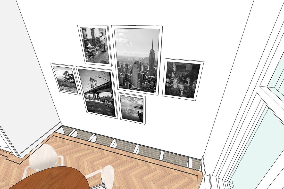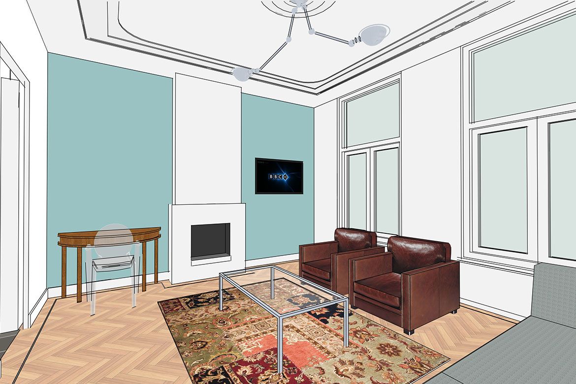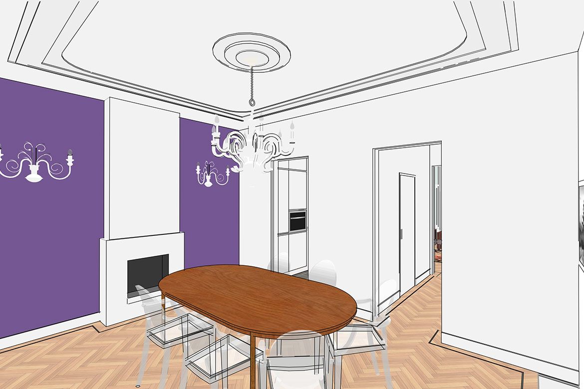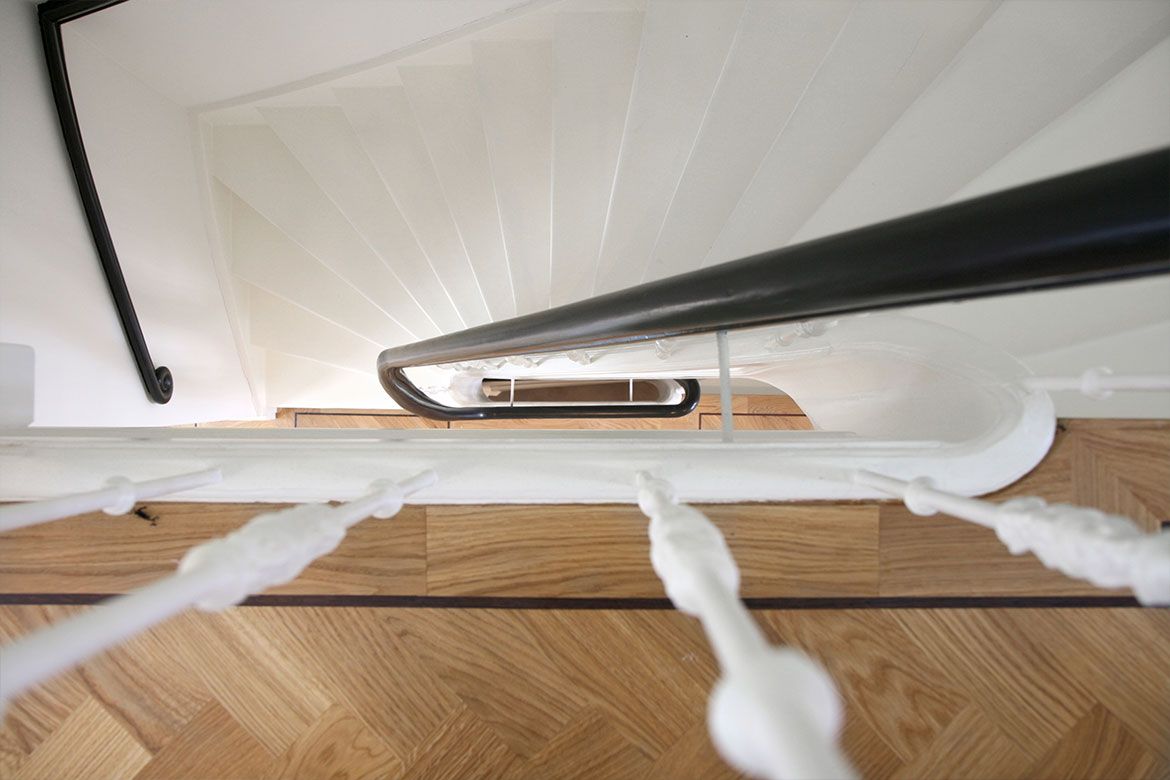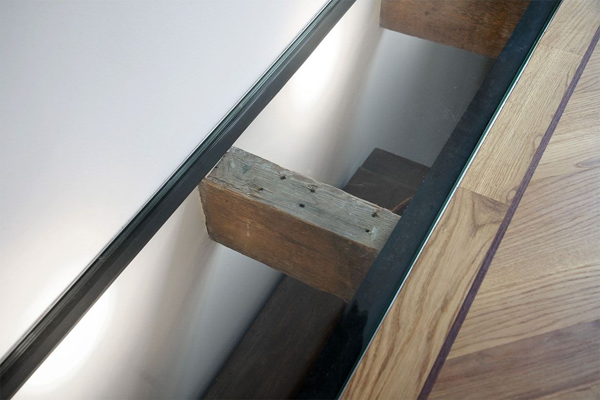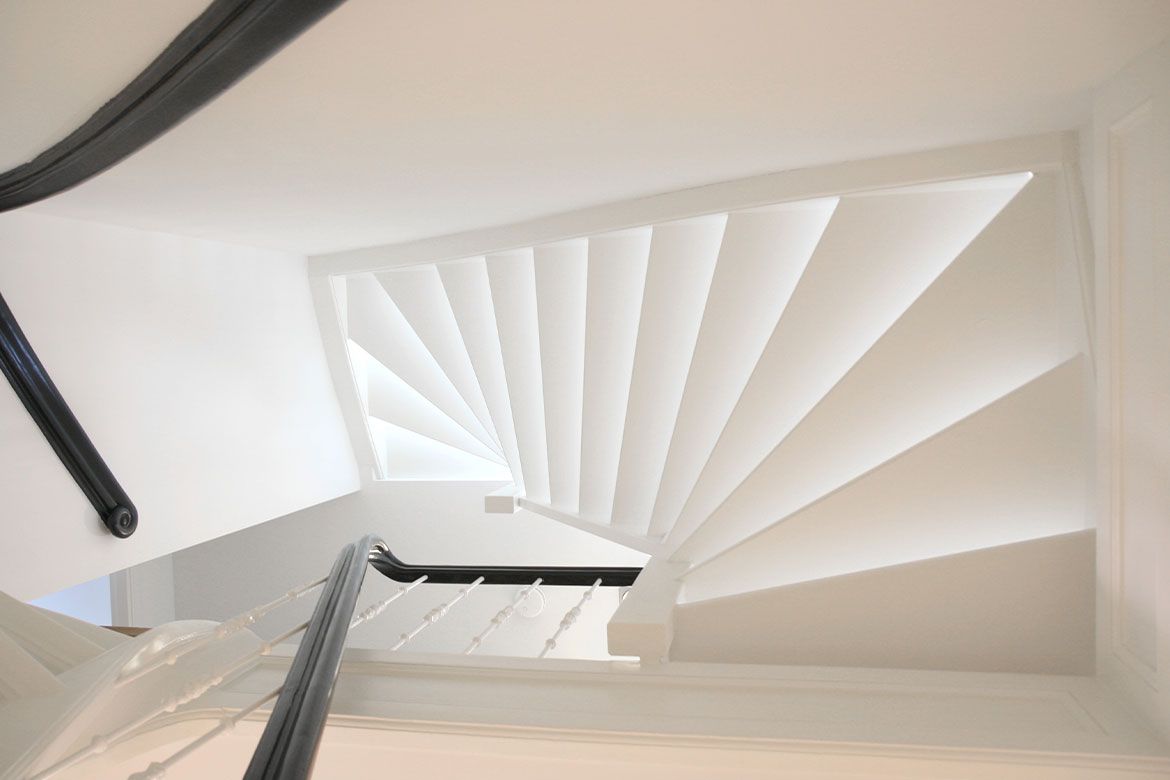 Op de begane grond wordt een grote keuken gerealiseerd, slim gebruik makend van bestaande elementen als de schouw. De eerste verdieping, waar nog veel originele details aanwezig zijn, wordt verbouwd tot woonkamer en eetkamer. De hoogte van deze verdieping wordt benadrukt door het toepassen van bijna verdiepingshoge ‘onzichtbare’ schuifdeuren. Om de relatie tussen de keuken en eetkamer te benadrukken en de keuken te voorzien van het nodige daglicht wordt er een sparing aangebracht in de vloer tussen beide ruimtes.