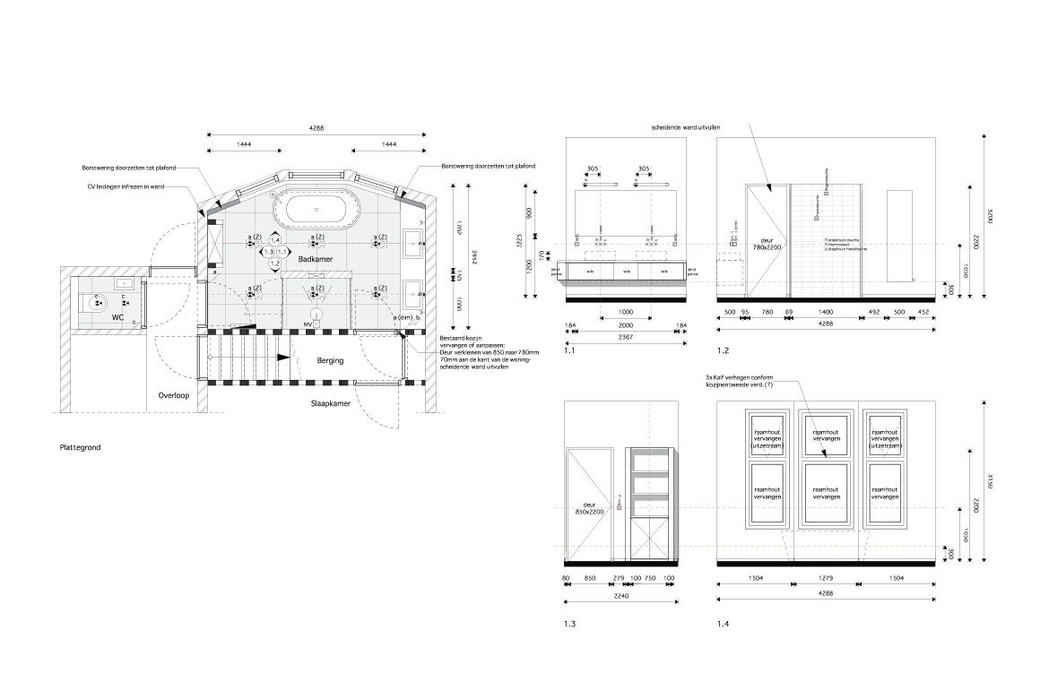 Er is veel aandacht besteed aan de details: het wastafelmeubel is maatwerk van Houtmerk, waardoor de kast precies tussen de beide schuine wanden past. Ook de schappen op de muur en de opbergkast in de badkamer zijn maatwerk. Het ontwerpen van deze meubels en elementen maakten onderdeel uit van onze werkzaamheden.