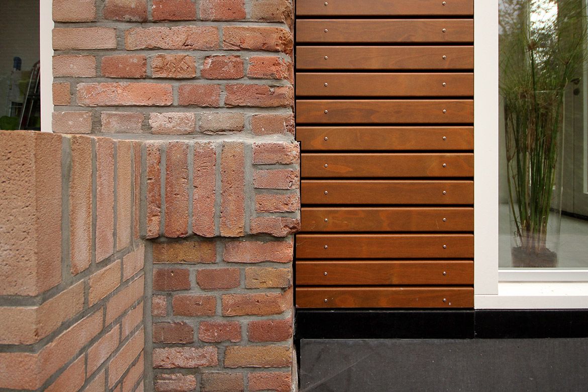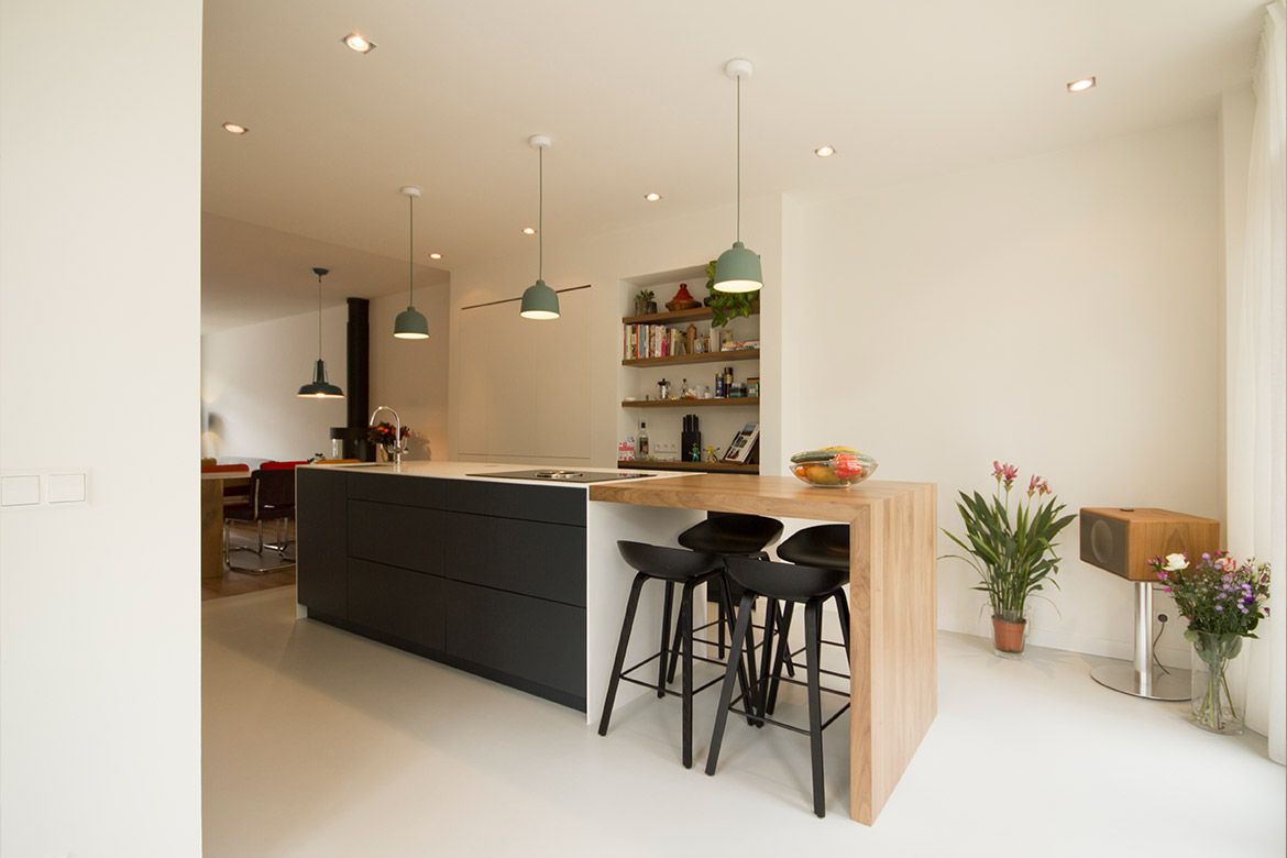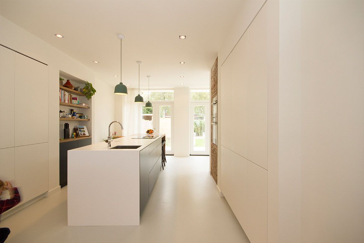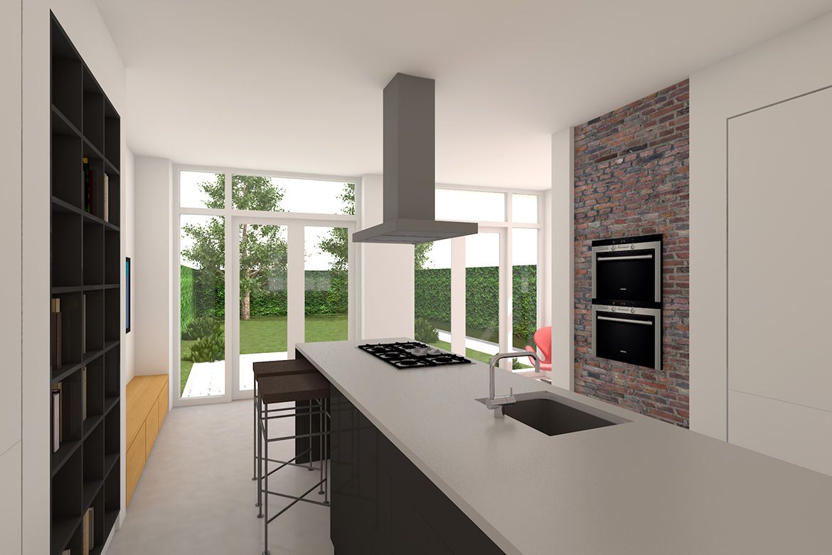 De extra ruimte wordt in het interieur benut voor het creeƫren van een ruime woonkeuken en bijkeuken. Een klein deel van de originele buitenmuur komt in het interieur terug als ruwe baksteen muur waarin de ovens van de keuken verwerkt zijn.