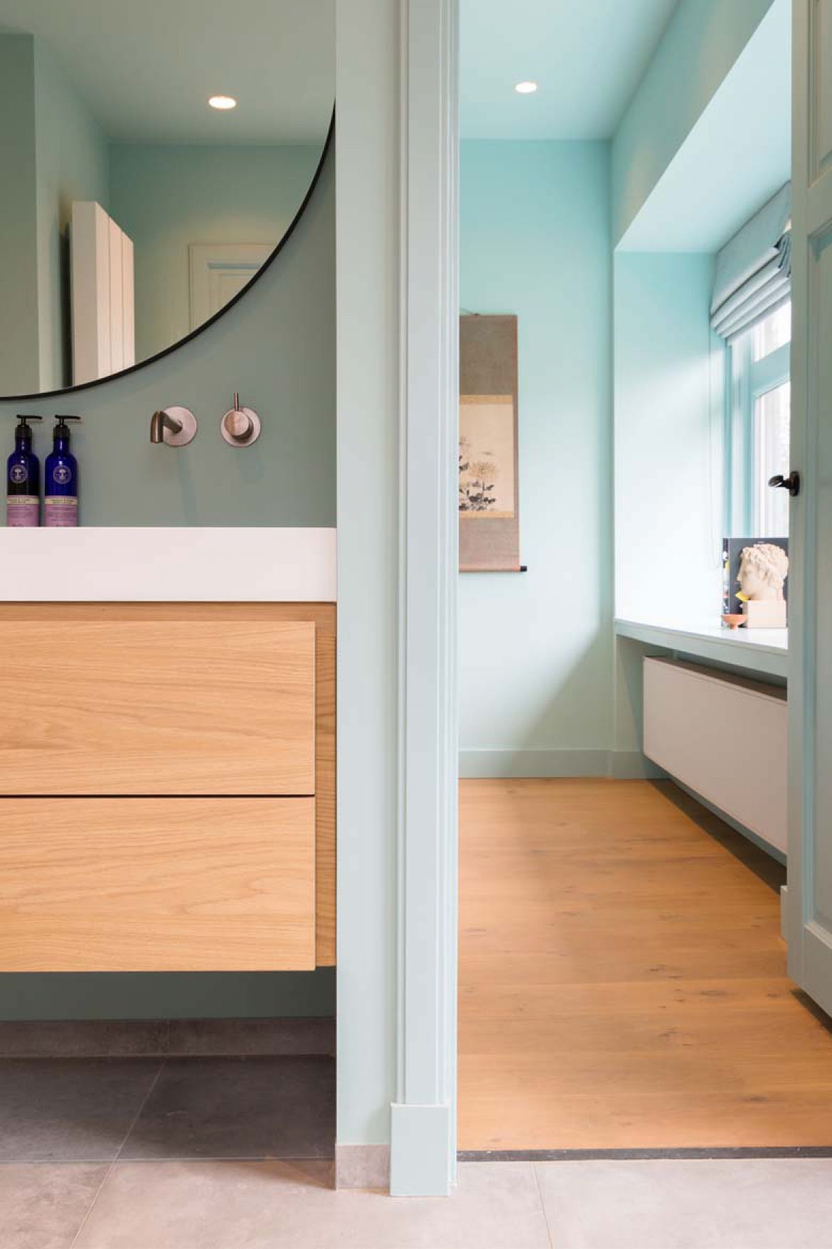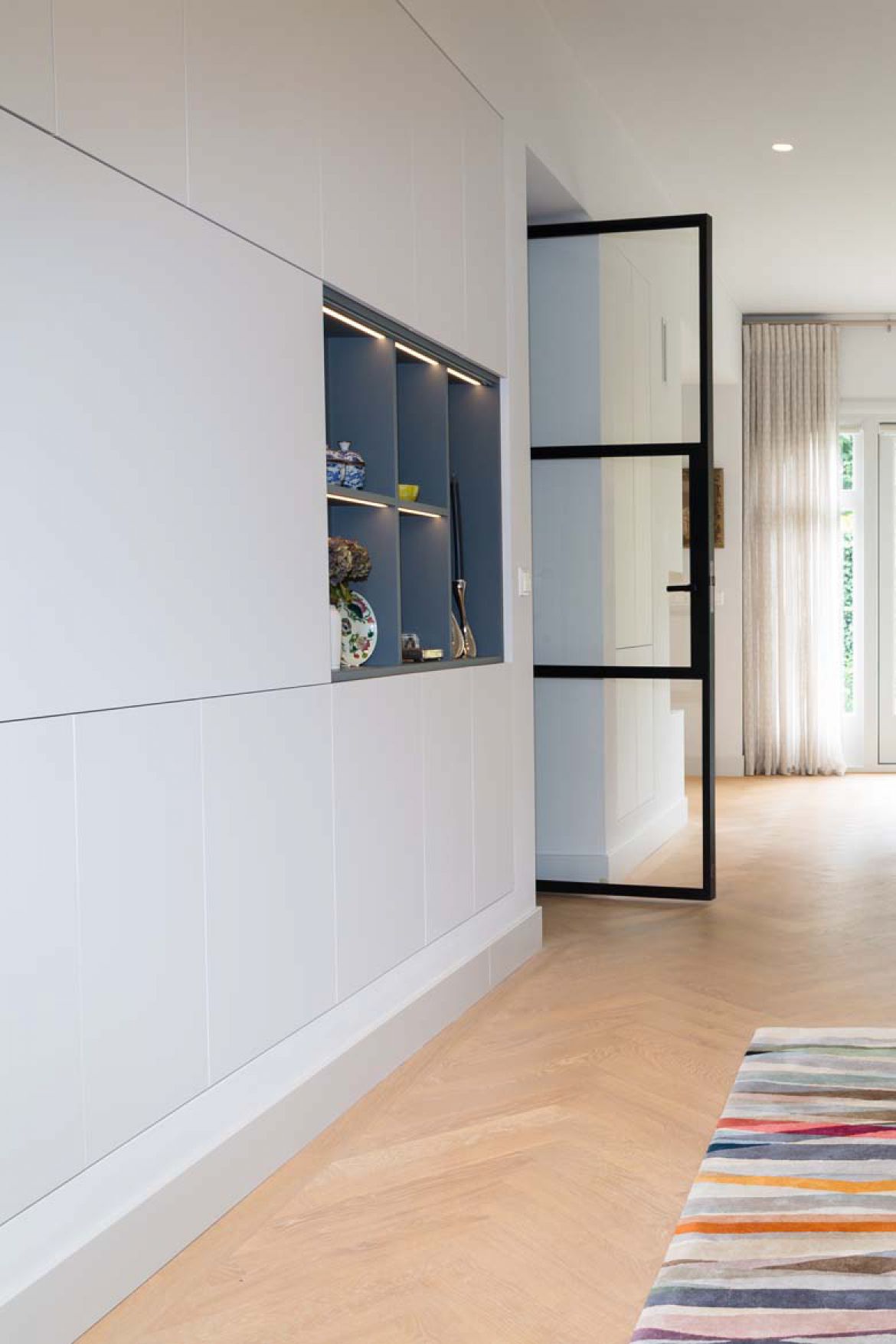 Het interieur kenmerkt zich door een mix van authentieke elementen, maatwerk oplossingen en bijzonder kleurgebruik. Door de aanbouw ontstaat er een wat meer uitgesmeerd woonprogramma op de begane grond. Bij binnenkomst is niet in één oogopslag zichtbaar waar zich de verschillende functies bevinden. In de woonkamer is de dragende wand opgedikt door een maatwerk kastenwand waarin onder meer een tv, servieskast en openhaard zijn weggewerkt. Op de plek van de oude keuken is een zitje bij de openhaard gecreëerd en bevindt zich de toegang tot de keuken. Op alle plekken is er toegang tot de fraai aangelegde tuin mogelijk.