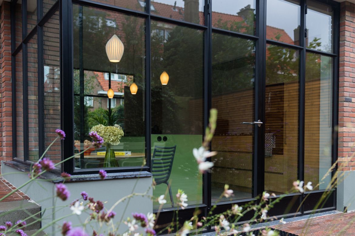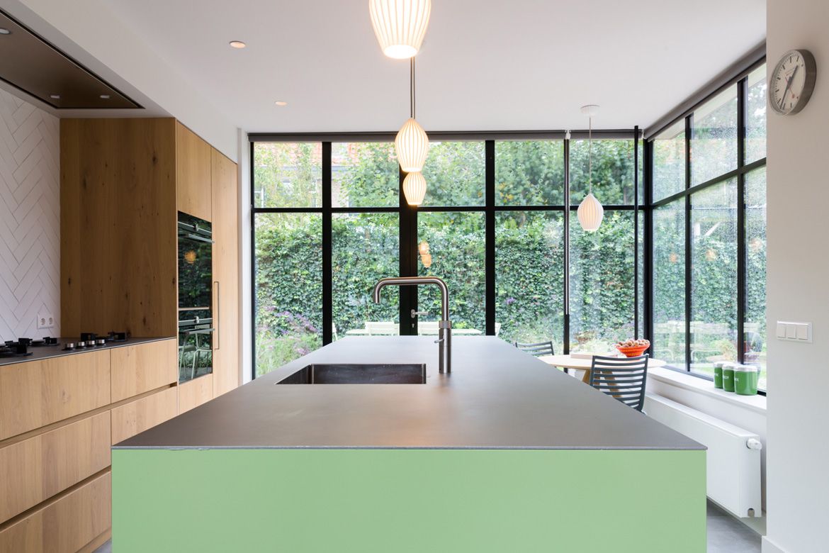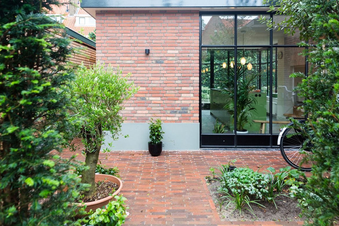 Na een uitgebreid ontwerptraject, waarbij veel verschillende varianten de revue passeerden, is uiteindelijk gekozen voor een verbouwing met een compacte aanbouw. De aanbouw is passend bij de woning ontworpen en ondergeschikt gemaakt aan het hoofdvolume. Om toch voldoende stahoogte te creëren ligt de aanbouw iets lager dan de begane grondvloer. Dit vertaalt zich in een speelse indeling én een leefkeuken die volledig op tuinniveau ligt. De aabouw heeft aan weerszijden nagenoeg volledig glazen gevels. De ranke, stalen kozijnen geven de aanbouw een elegante aanblik.