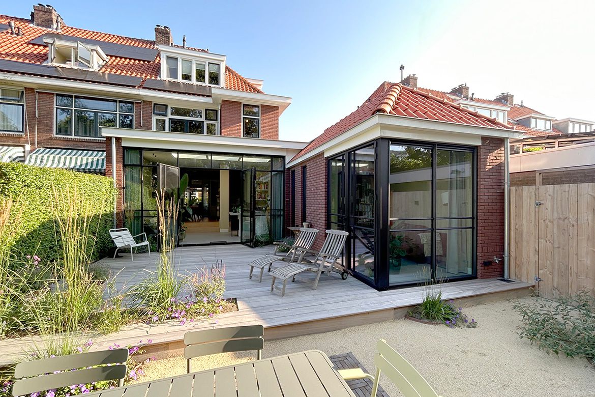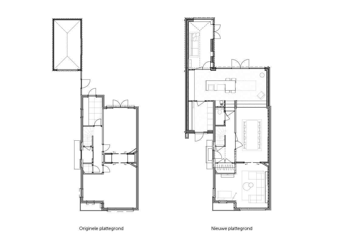 In een rustige straat in Hillegersberg (Rotterdam) verbouwden we dit van origine relatief kleine hoekpand tot een ruim gezinshuis. Een nieuwe aanbouw biedt ruimte aan keuken en bijkeuken, en verbindt het huis met de voormalige garage, die opnieuw is opgebouwd als tuinkamer. Op de aanbouw staat een (kleine) opbouw om op die manier de kleine studeerkamer op de 1e verdieping iets te vergroten.