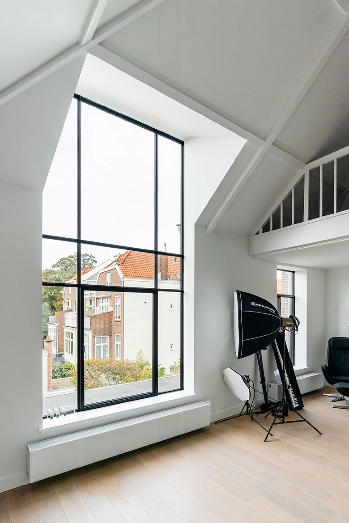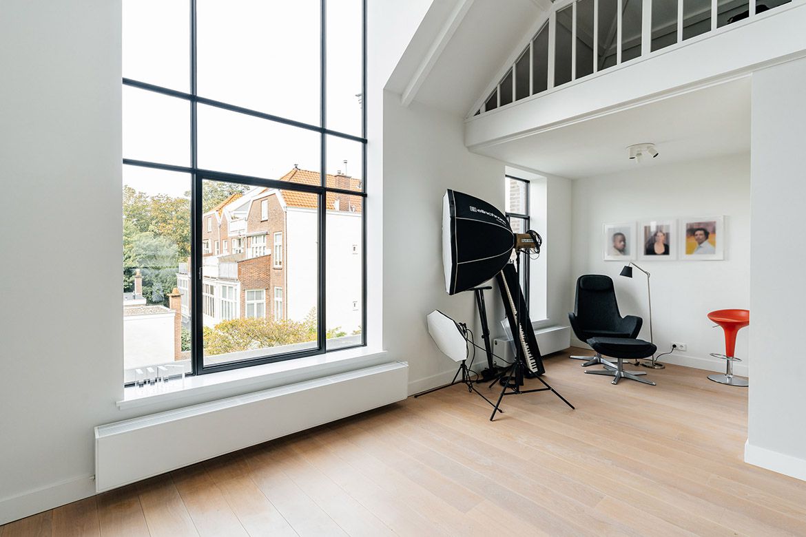 De tweede etage is in gebruik als werkplek en fotostudio. Door ook hier de gevels en dak volwaardig te isoleren is de koude zolder veranderd in een fijne plek om te verblijven. Het entresol op de zolder biedt ruimte aan een knusse logeerplek.