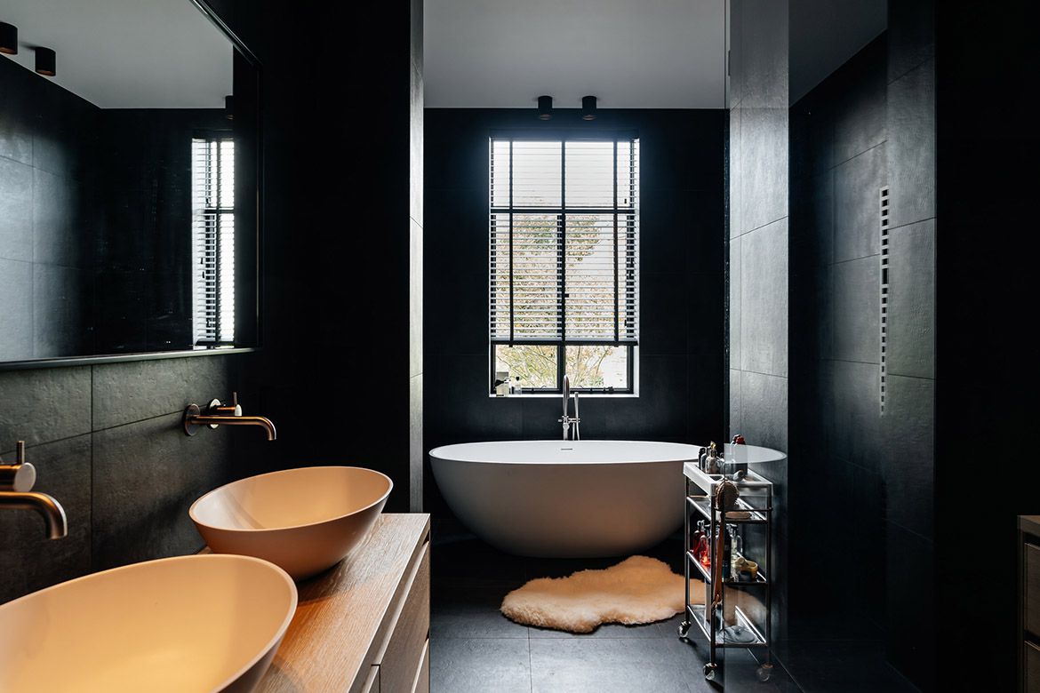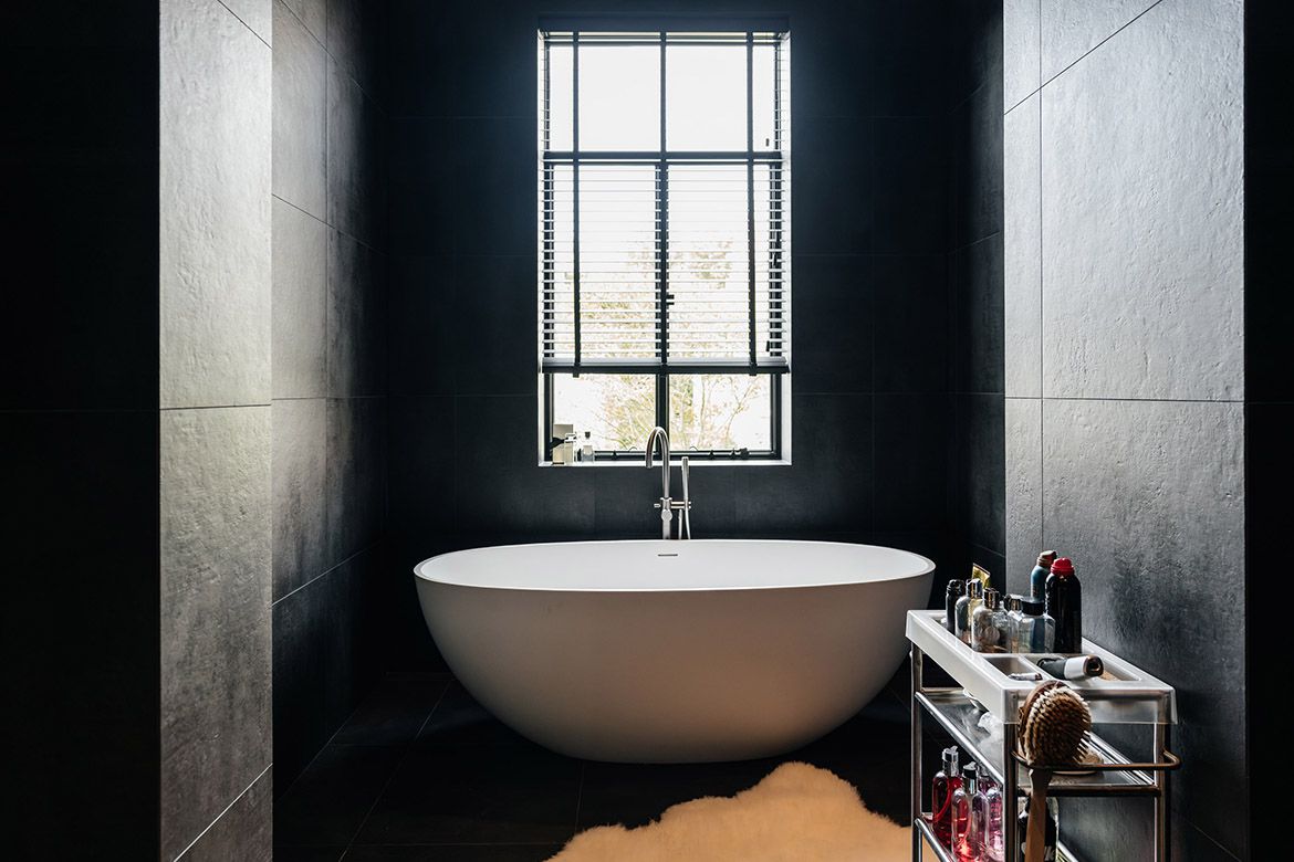 Een fraai accent is de volledig betegelde, zwarte badkamer met als centerpiece een vrijstaand bad onder het raam.