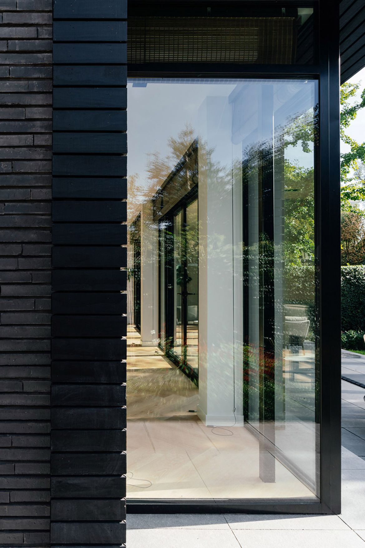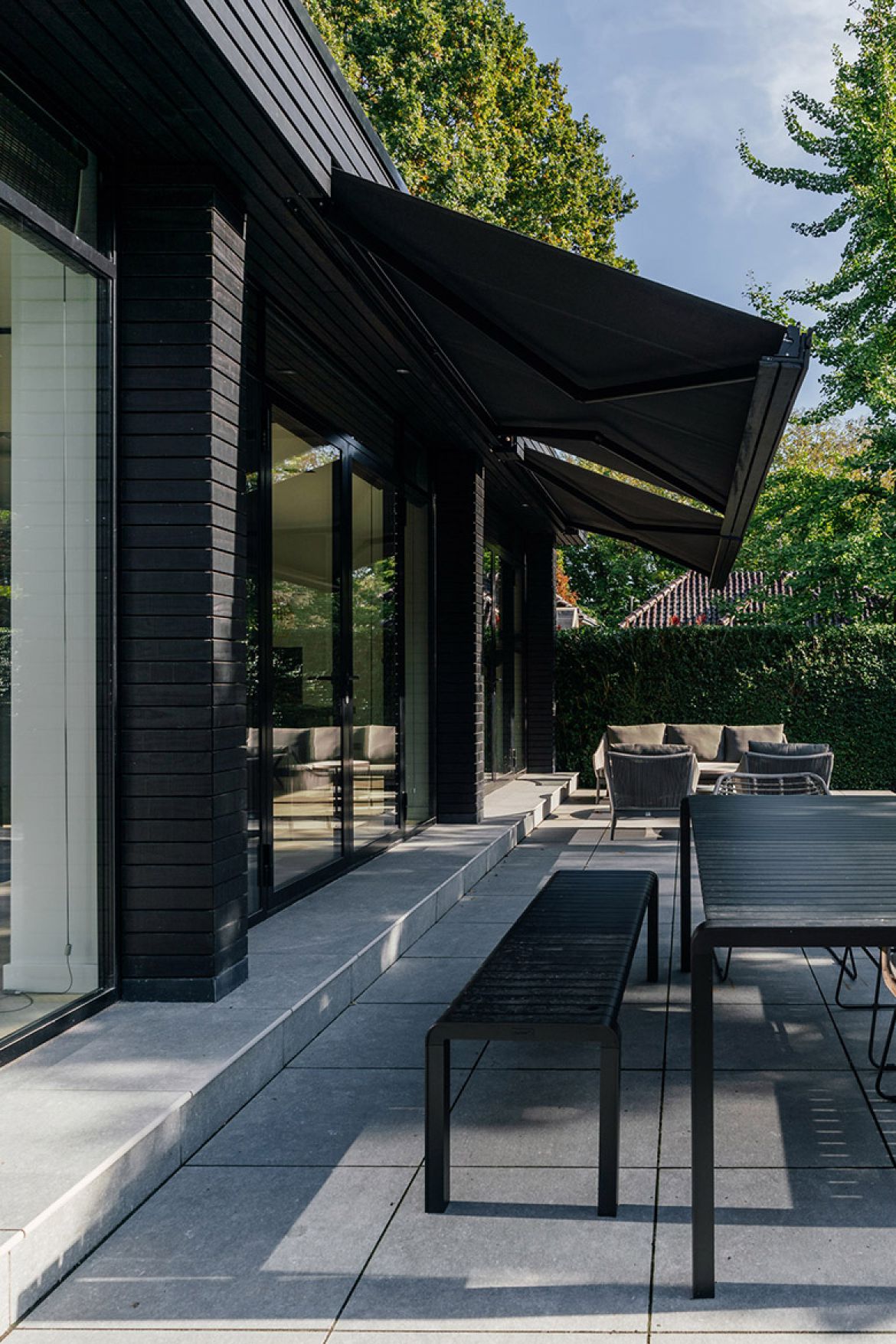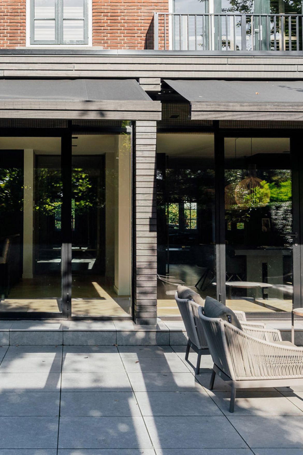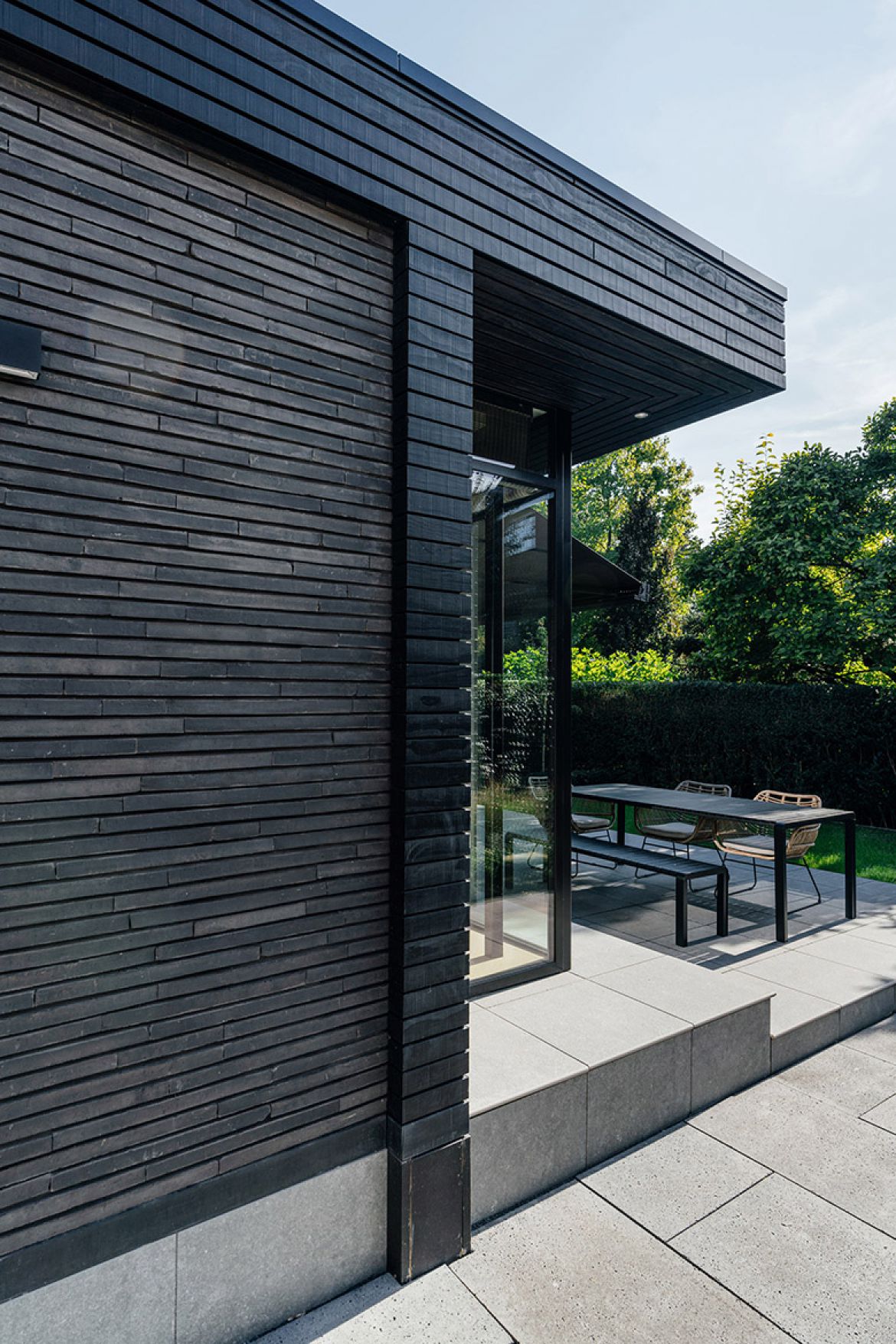 De buitenzijde van de aanbouw is afgewerkt met een combinatie van zwarte horizontale latten en baksteen van Petersen Tegl. Door gebruik te maken van grote overstekken en uitstekende penanten wordt de zon in de zomer zoveel mogelijk buiten gehouden, terwijl in de overstek verwerkte knikarmschermen de mogelijkheid bieden de zon ook op andere momenten te weren.