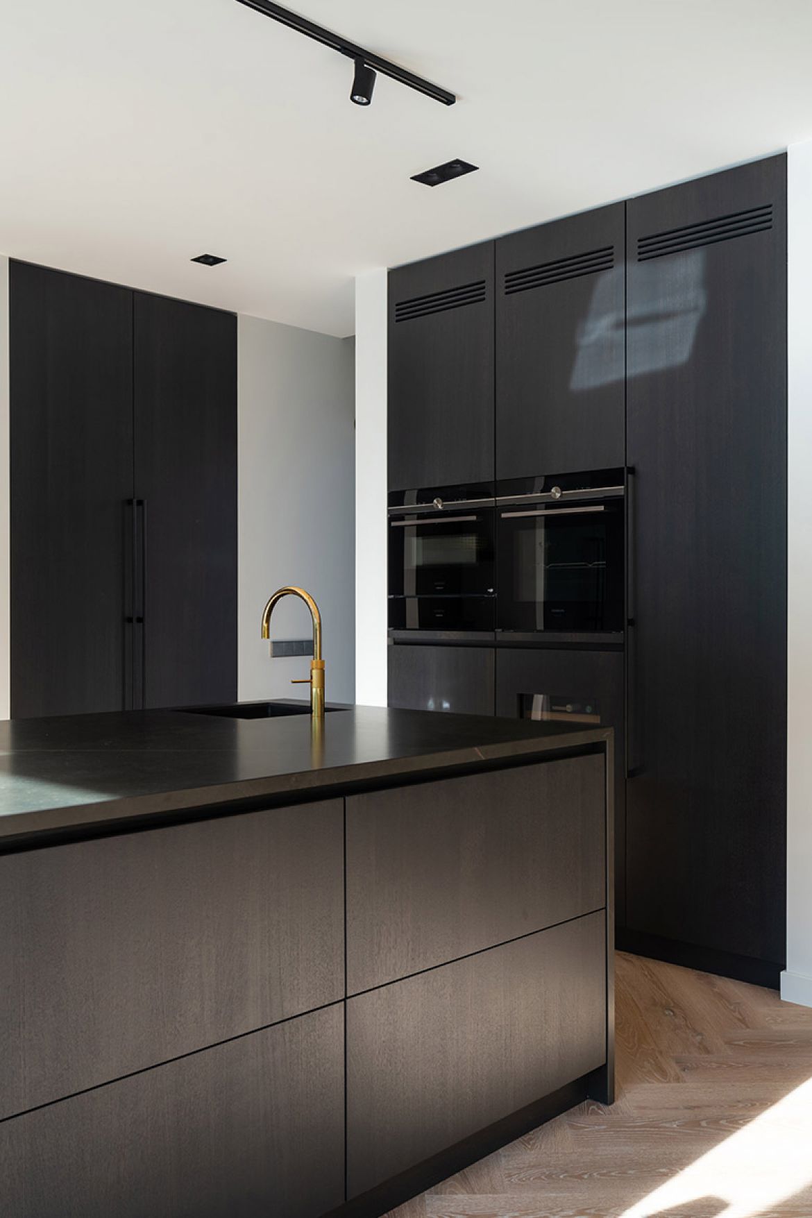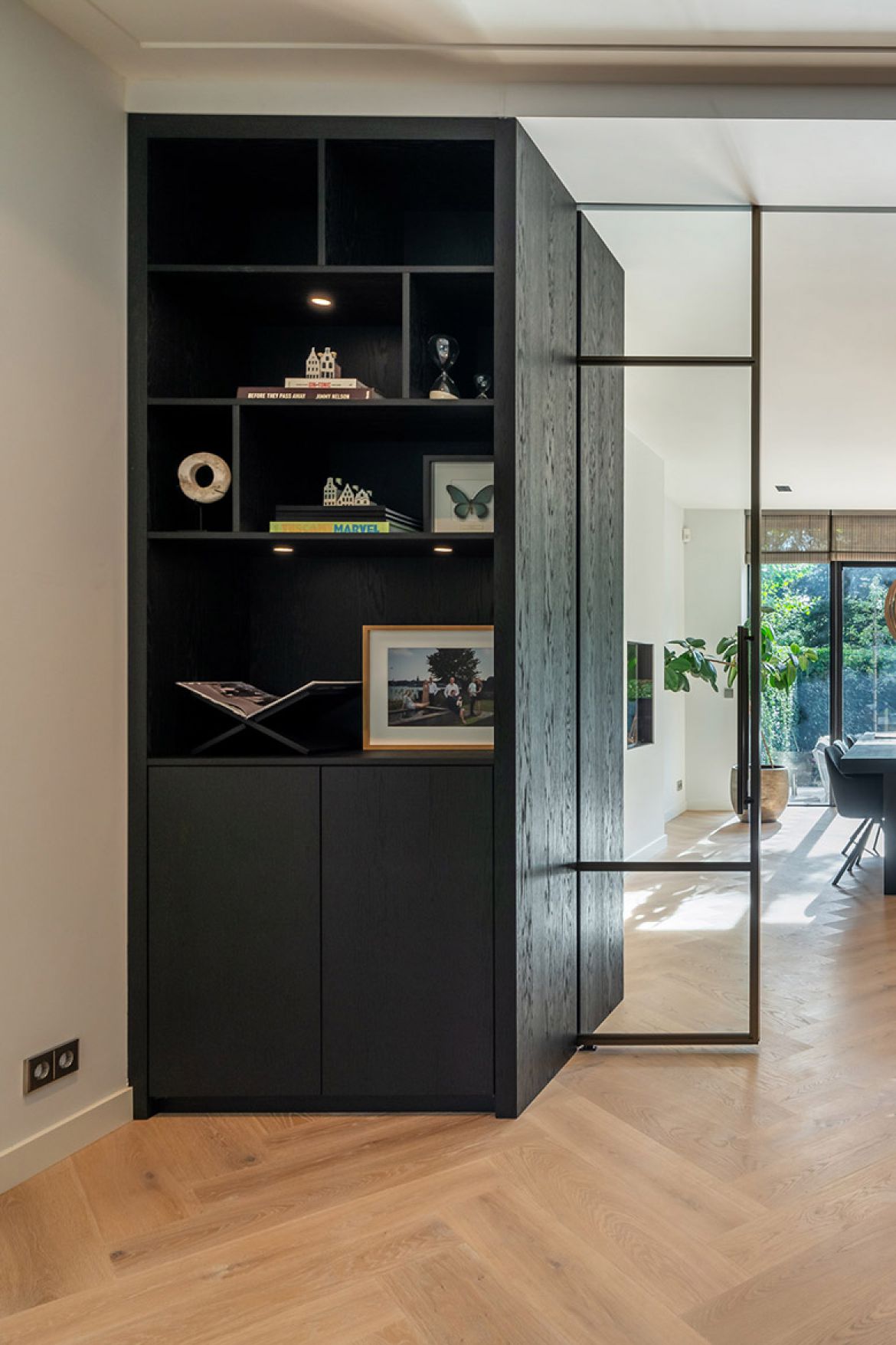 De nieuwe aanbouw biedt plaats aan een ruime eetkamer en keuken, die met een op de originele plek teruggebrachte, maar modern uitgevoerde, schuifseparatie is afgesloten van de woonkamer.