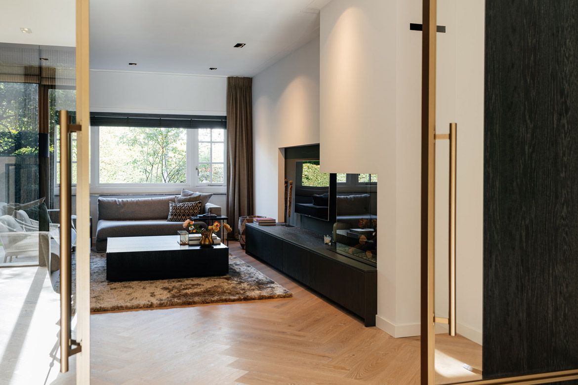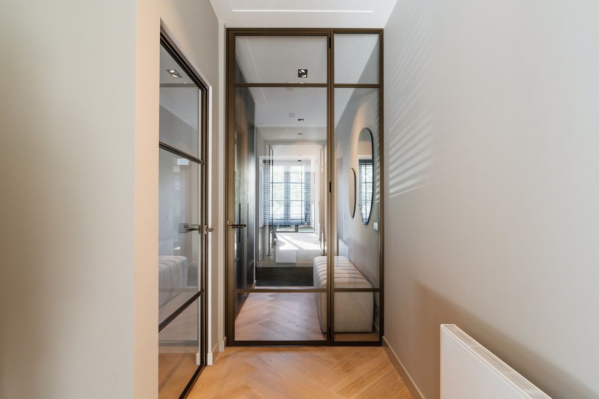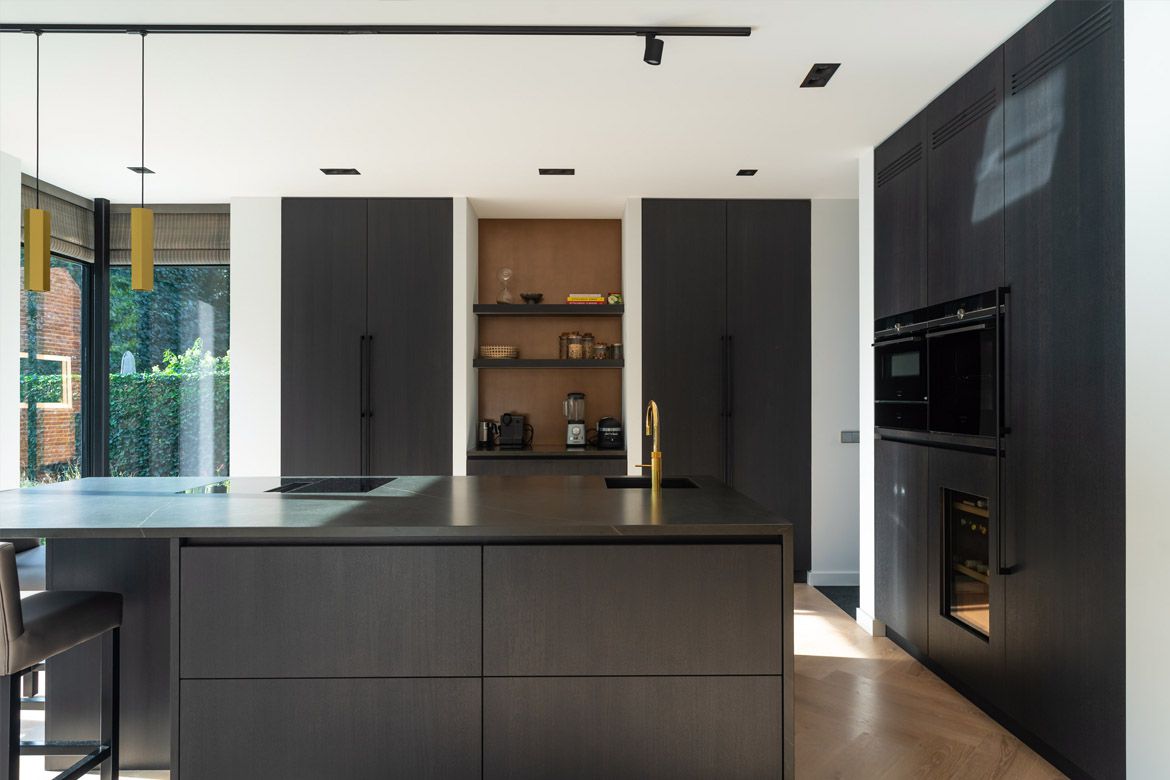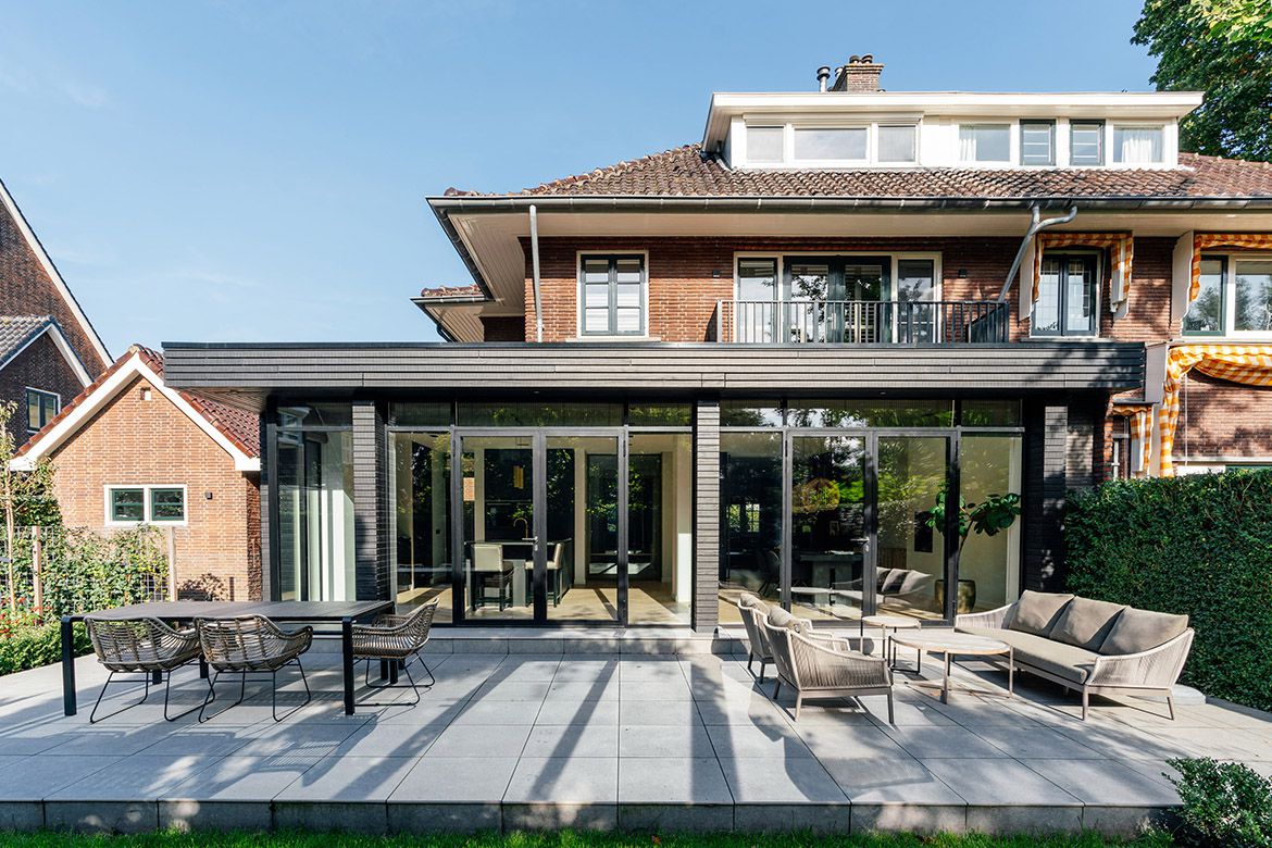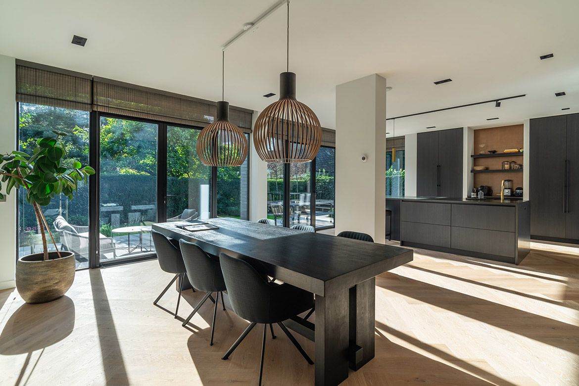 De nieuwe aanbouw biedt plaats aan een ruime eetkamer en keuken, die met een op de originele plek teruggebrachte, maar modern uitgevoerde, schuifseparatie is afgesloten van de woonkamer.
