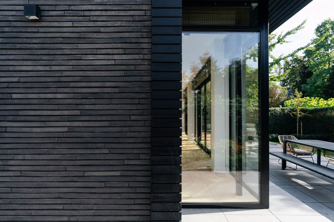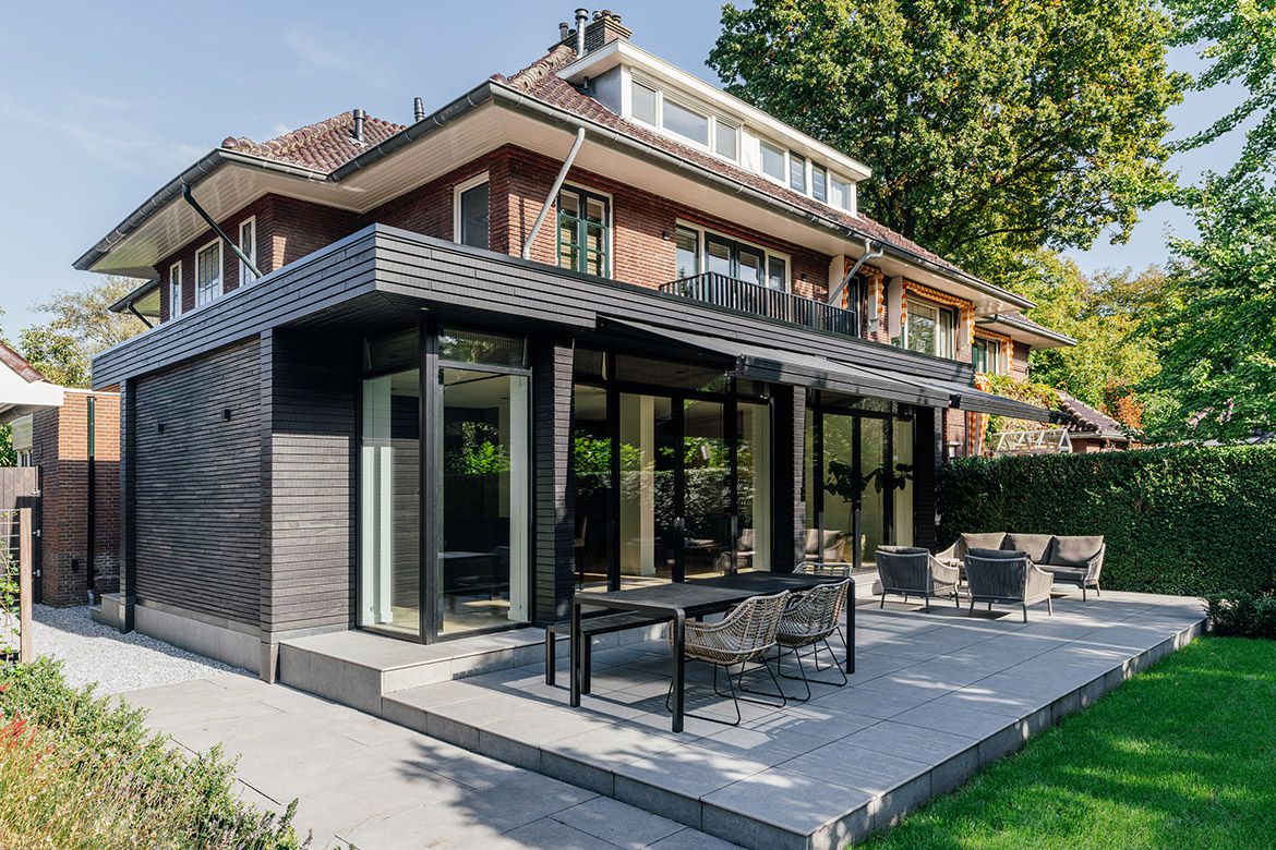 De buitenzijde van de aanbouw is afgewerkt met een combinatie van zwarte horizontale latten en baksteen van Petersen Tegl. Door gebruik te maken van grote overstekken en uitstekende penanten wordt de zon in de zomer zoveel mogelijk buiten gehouden, terwijl in de overstek verwerkte knikarmschermen de mogelijkheid bieden de zon ook op andere momenten te weren.