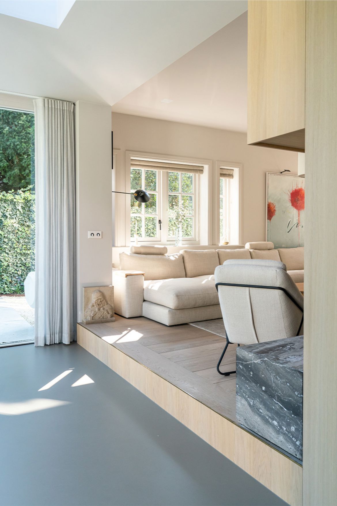 Door de speelse indeling van de begane grond zijn veel verschillende plekken en hoekjes ontstaan. De woonkamer vormt het middelpunt, met daar omheen de af te sluiten bioscoopkamer en de ruimtelijke leefkeuken. Je kunt je in de woning terugtrekken, terwijl je toch bij elkaar in de buurt bent.