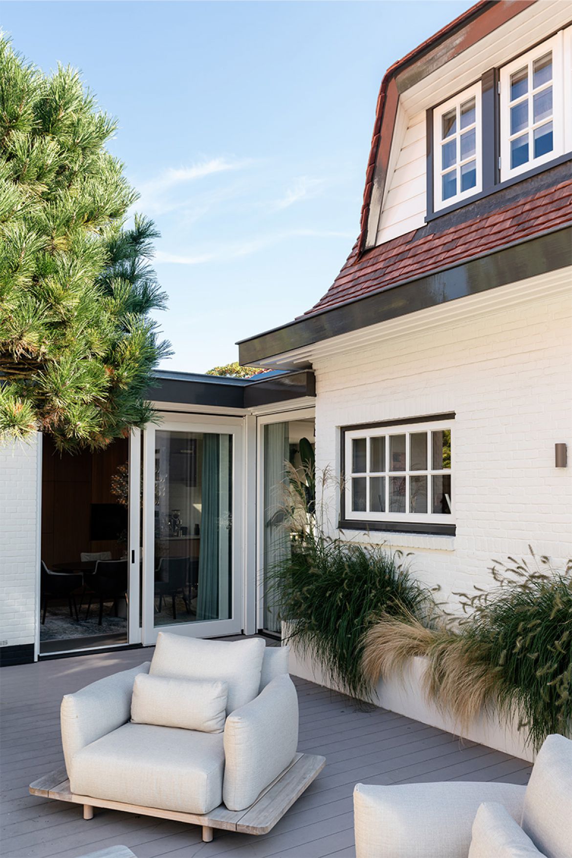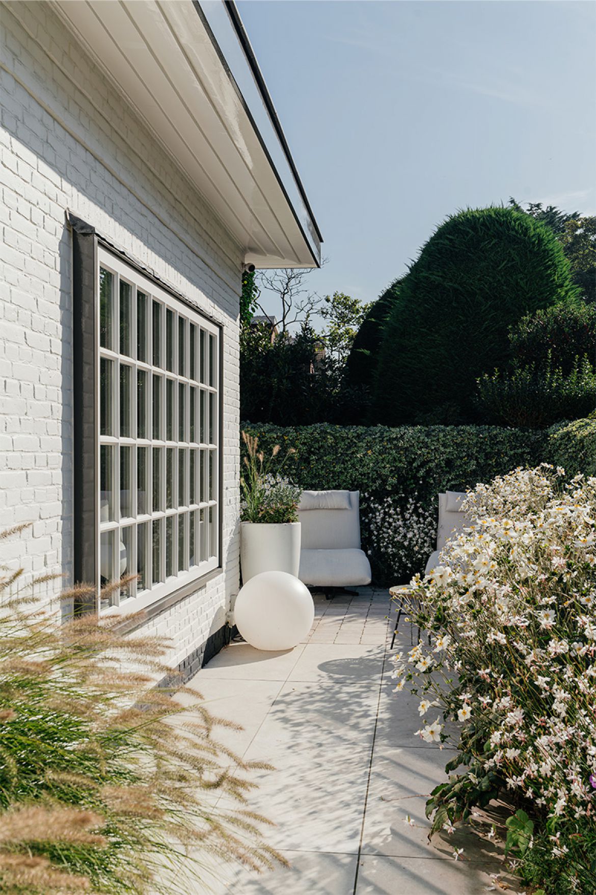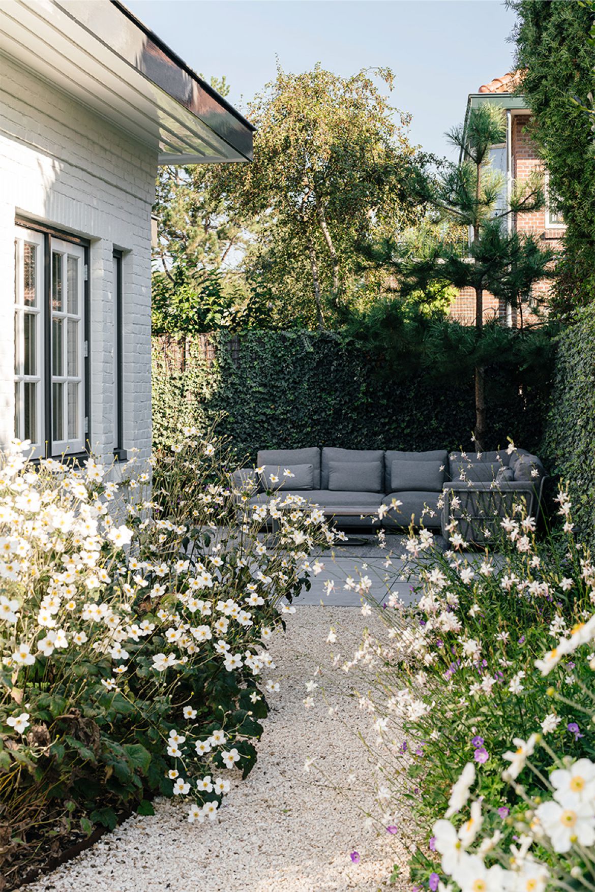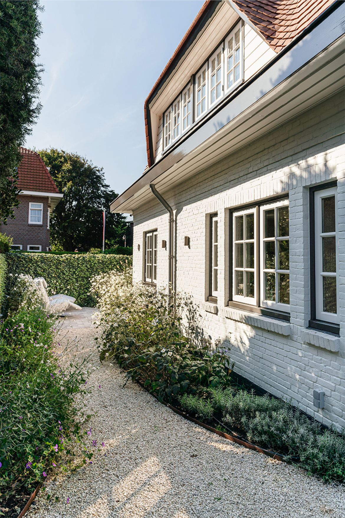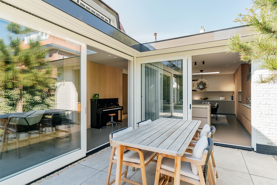 De aanbouw bestaat voor een groot gedeelte uit raampartijen, waardoor een optimaal contact met de tuin gecreëerd wordt. Ook de voormalige oprit is tuin geworden. Door het open karakter van de nieuwe aanbouw loop je gemakkelijk de tuin in en daarmee rondom het huis. Het geeft de bewoners het juiste gevoel van het buitenleven, zonder het hebben van een enorm perceel.