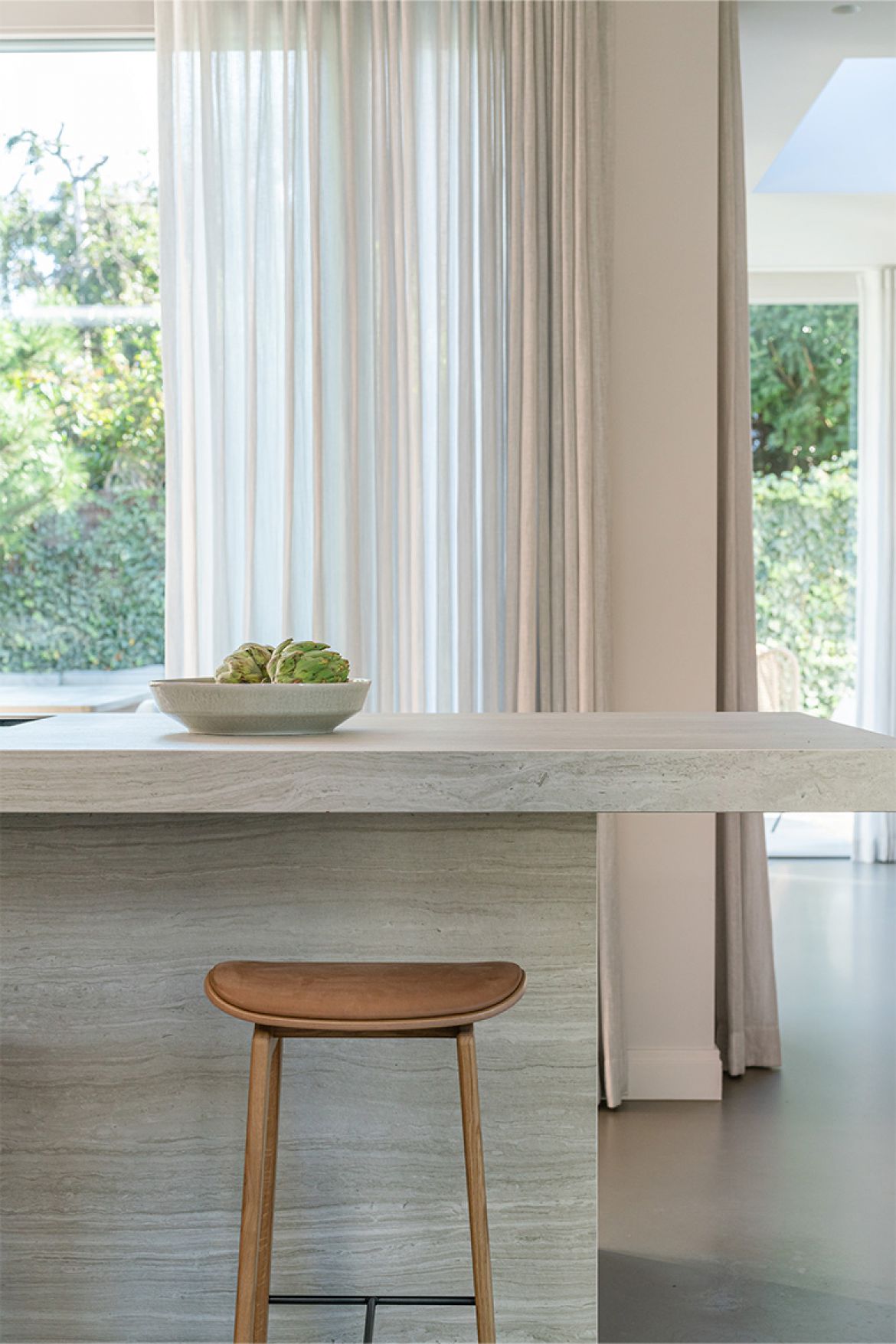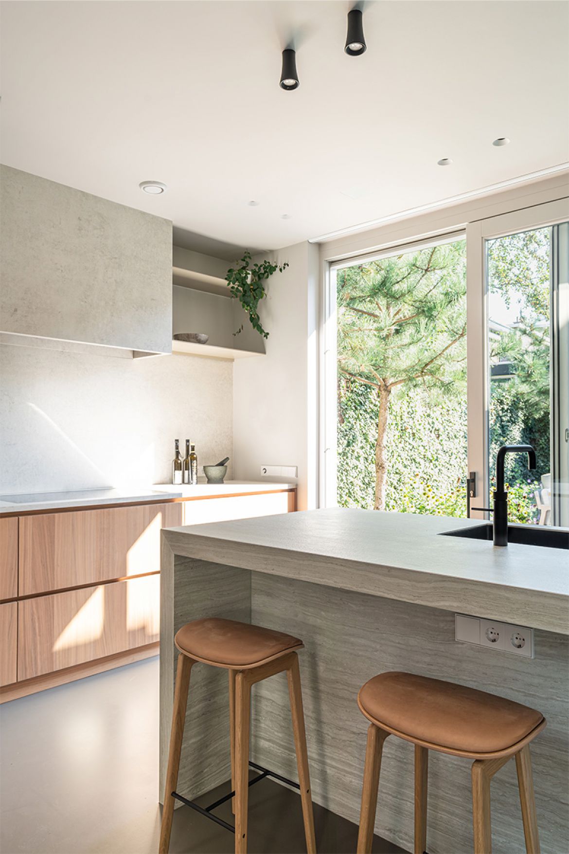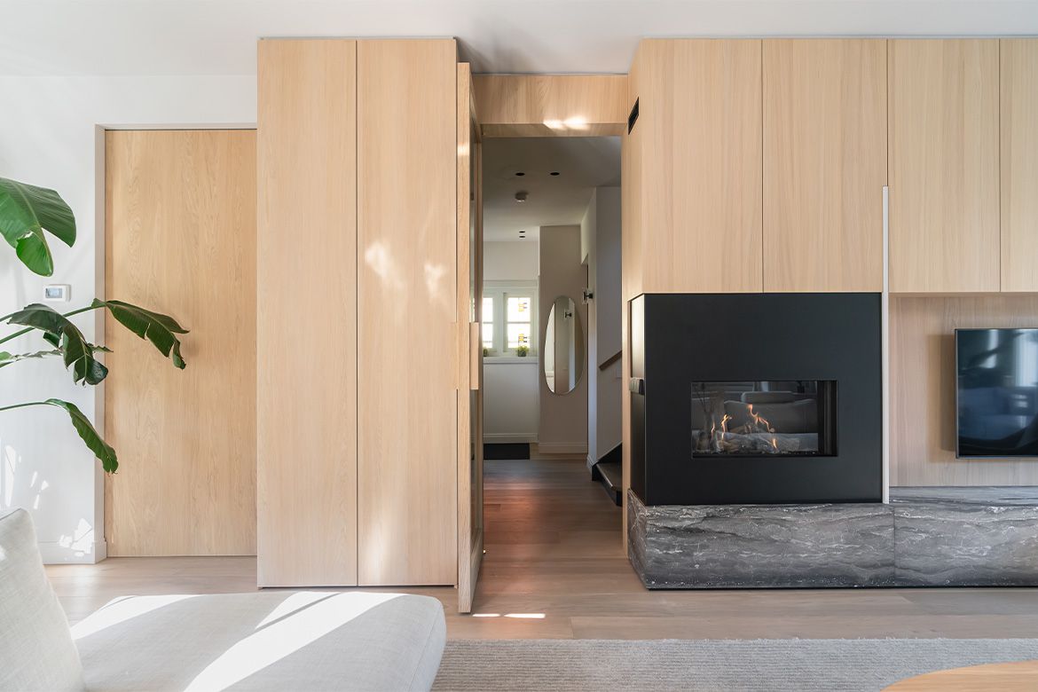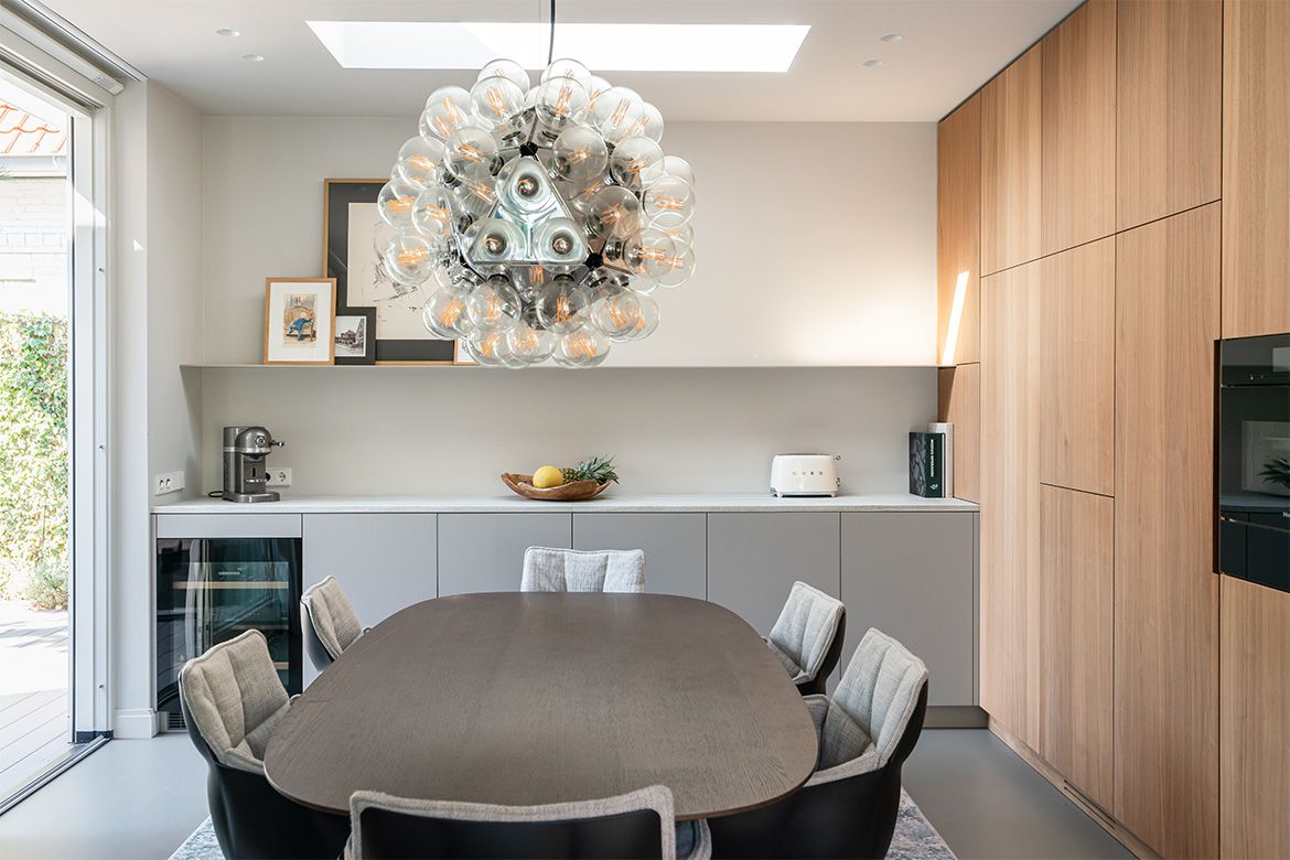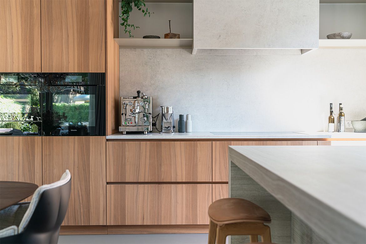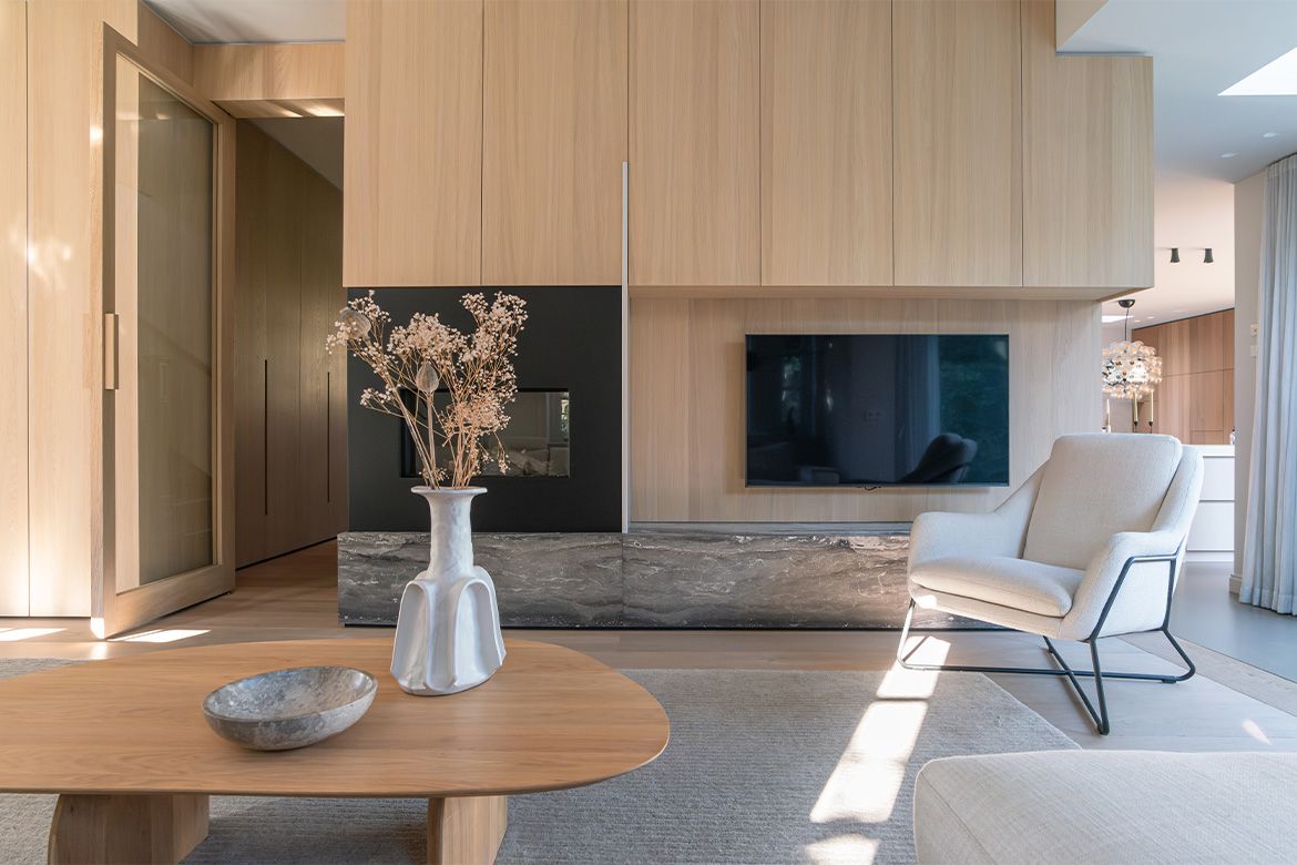 Voor het interieur werkten we samen met Studio Wendy Mahieu, wat zich heeft vertaald in een serene aaneenschakeling van ruimtes. Centraal in de woning staat een volume van hout, waarin veel functies zijn ondergebracht, zoals kasten en (schuif)deuren. Vanuit alle hoeken en ruimtes op de begane grond is dit houten volume te zien. Het biedt interessante doorkijkjes en looproutes, maar tegelijkertijd ook veel praktische bergruimte.
